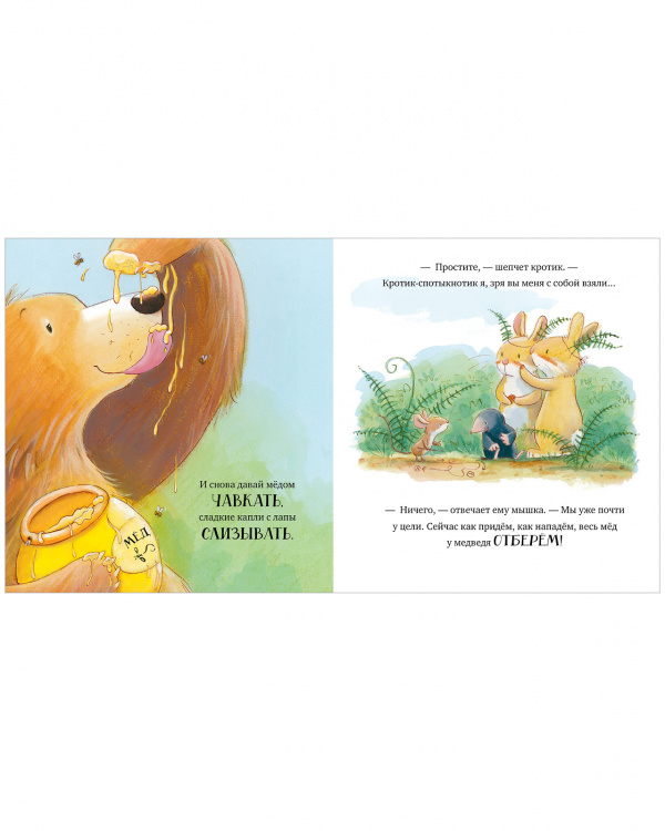 Книжка-картинка «Лапы прочь от меда!» расскажет о дружбе и покажет, что делиться всегда веселее, чем жадничать. Она создана для первого чтения с малышами 3–5 лет: по большим сюжетным иллюстрациям ребенок без труда сможет «прочитать» историю, а текста на страницах ровно столько, чтобы он не успел заскучать.