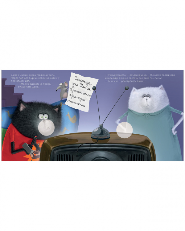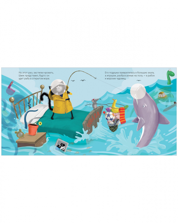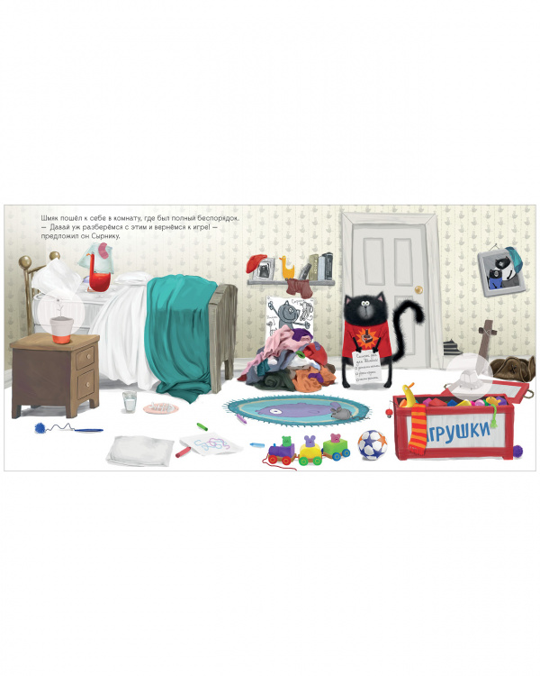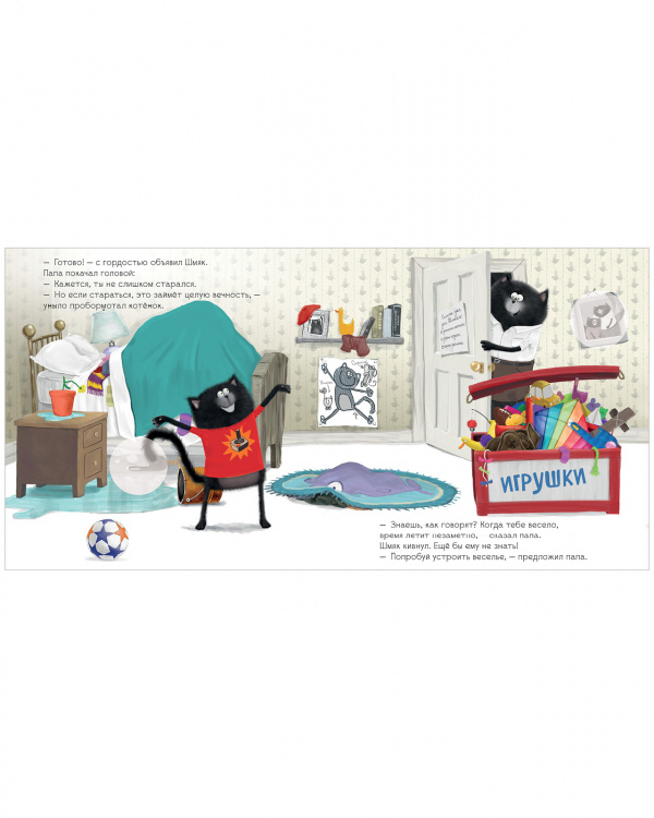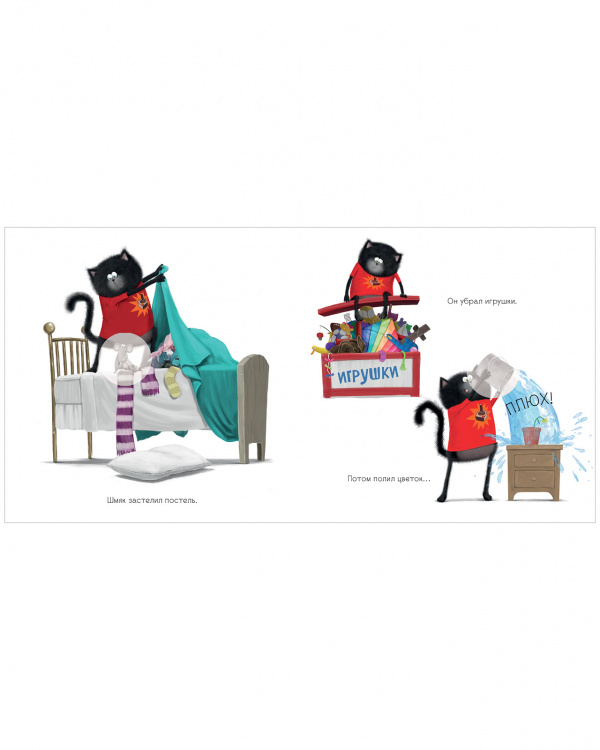 Как приучить малыша помогать по дому? Папа котенка Шмяка знает один секрет! На семейном совете было решено, что теперь у Шмяка будет свой список домашних дел. Но... убирать игрушки, застилать постель, поливать цветы — это целая вечность пройдет! «Когда тебе весело, время летит незаметно», — подсказывает папа Шмяку. Убирая игрушки в ящик, Шмяк представил, будто нашел пиратский клад на необитаемом острове, и теперь ему надо сложить все золотые монеты в сундук. Кто бы мог подумать, что уборка может быть такой веселой!