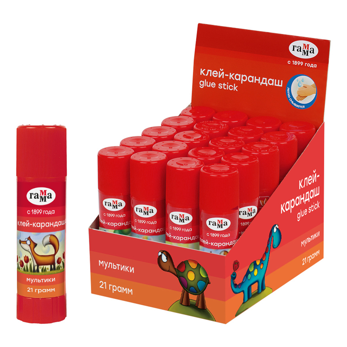 Клей-карандаш ПВП ГАММА серии «Мультики» – отличный помощник на уроках труда и занятиях творчеством. Вес – 21 грамм. Быстросохнущий клей белого цвета легко наносится и распределяется по поверхности, оставляет тонкий и ровный слой, что позволяет расходовать его экономично. Предназначен для склеивания бумаги (в том числе и фотобумаги), картона, ткани. Не оставляет следов на одежде и легко смывается водой. Клей производится на основе натуральных ингредиентов, не содержит растворителей, поэтому безопасен для детей. Круглый корпус удобно держать в детской руке. Клей поставляется в дисплей-боксах.
