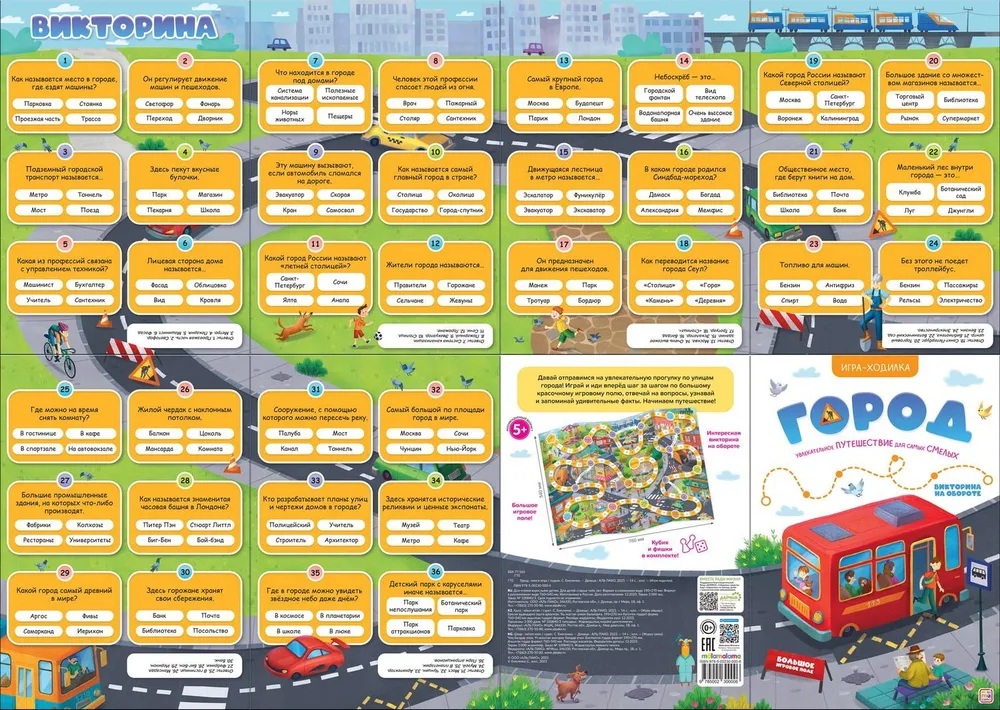 Игры-ходилки от торговой марки Malamalama — это весёлое и познавательное развлечение для малыша. Каждая книжка разворачивается в большой плакат, на одной стороне которого вы найдёте увлекательную настольную игру, а на другой — викторину с удивительными фактами. Вместе с игрой-ходилкой «Город» ребёнок отправится на весёлую прогулку по уютному городку. Продвигаясь вперёд по красочному игровому полю, малыш погрузится в живую атмосферу улиц и площадей. А на обороте будут ждать 36 интересных вопросов о городах и обо всём, что в них можно встретить. С этими вопросами ребёнок сможет проверить свои знания и расширить кругозор. Фишки и кубик включены в комплект — игра полностью готова к тому, чтобы подарить малышу множество весёлых моментов.