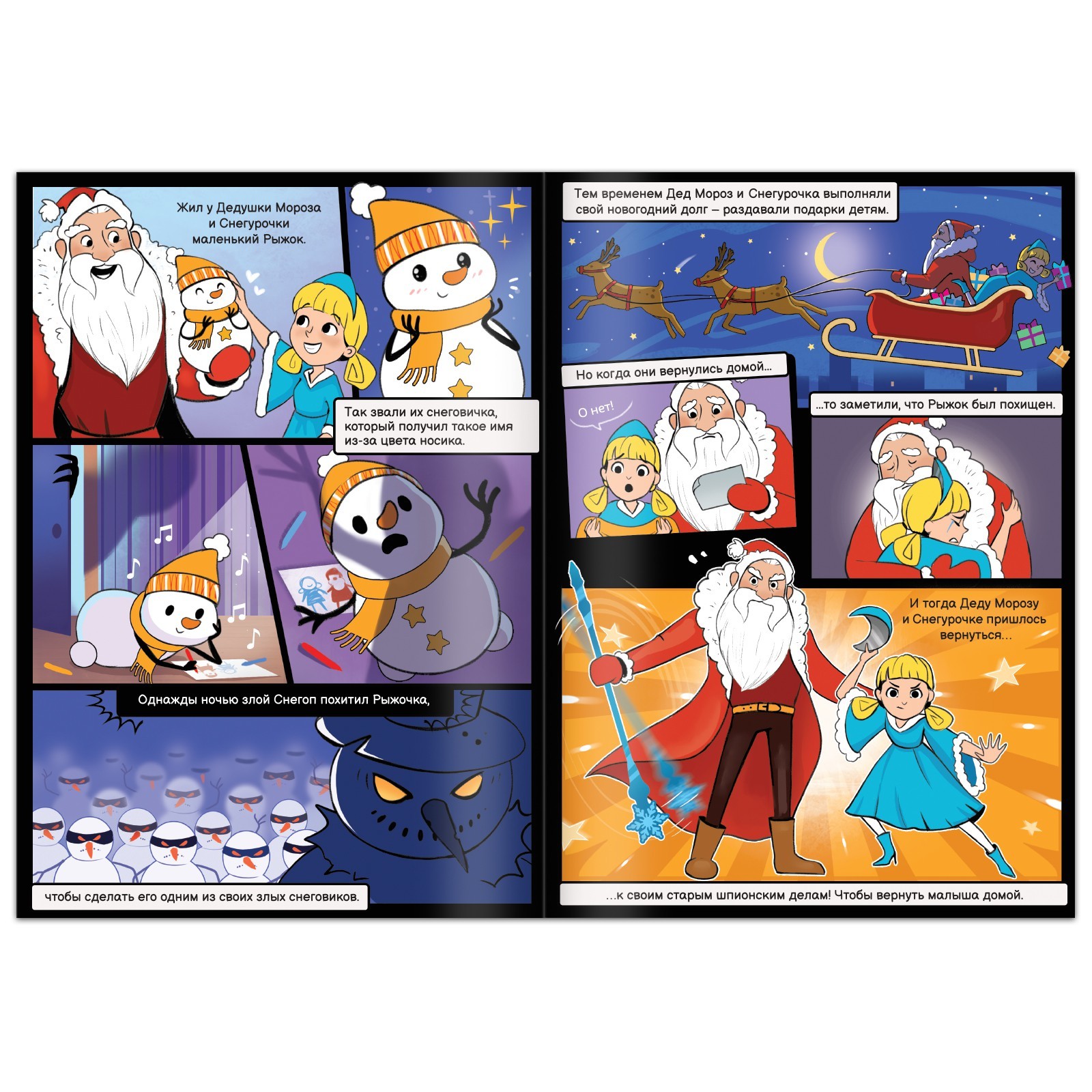 Дед Мороз и Снегурочка отправились в опасное путешествие. Похитили их друга Рыжка! Помогите сказочным персонажам пройти все испытания, победить злых снеговиков и спасти Рыжка!