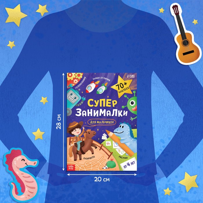 Книга с наклейками "Супер-занималки. Для мальчиков" 9671981. Разные задания, головоломки , раскраски, лабиринты не дадут заскучать вашему малышу.
