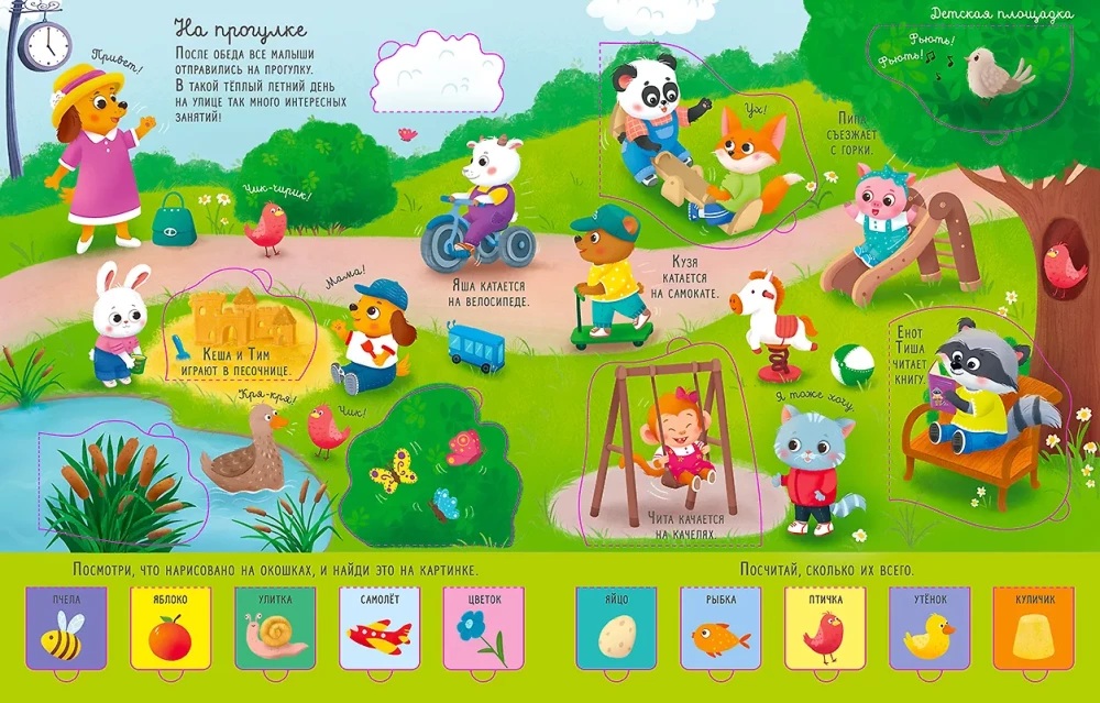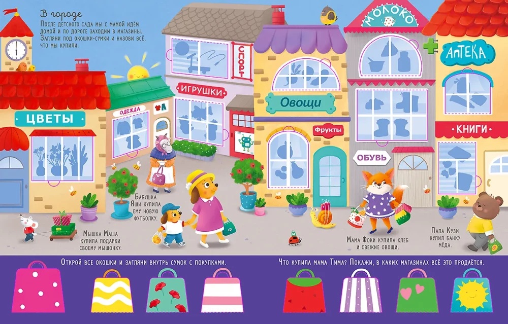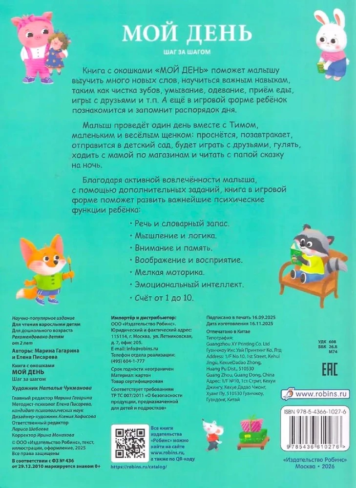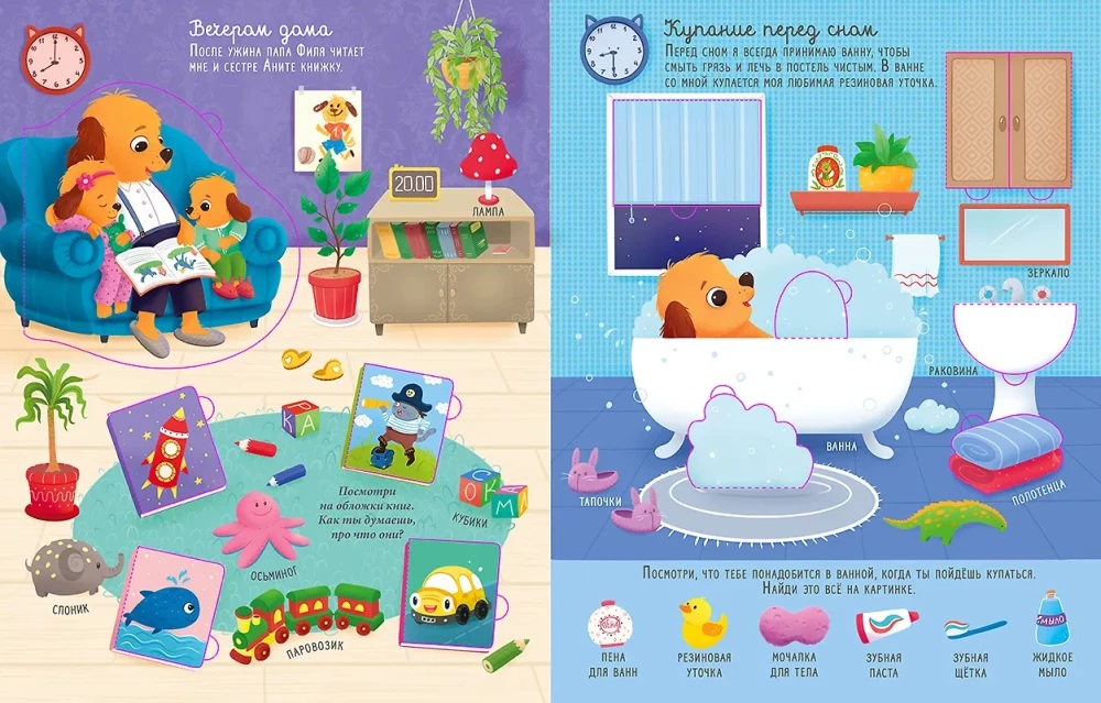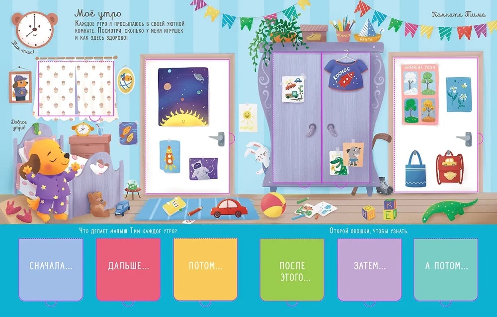 Книга с окошками «Мой день» поможет малышу выучить много новых слов, научиться важным навыкам, таким как чистка зубов, умывание, одевание, приём еды, игры с друзьями и т.п. А ещё в игровой форме ребёнок познакомится и запомнит распорядок дня.