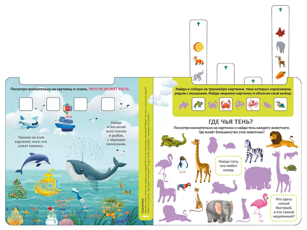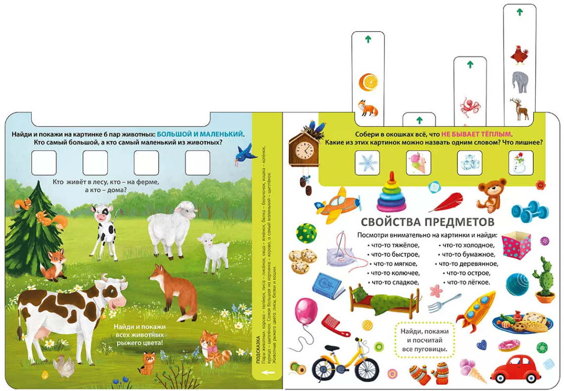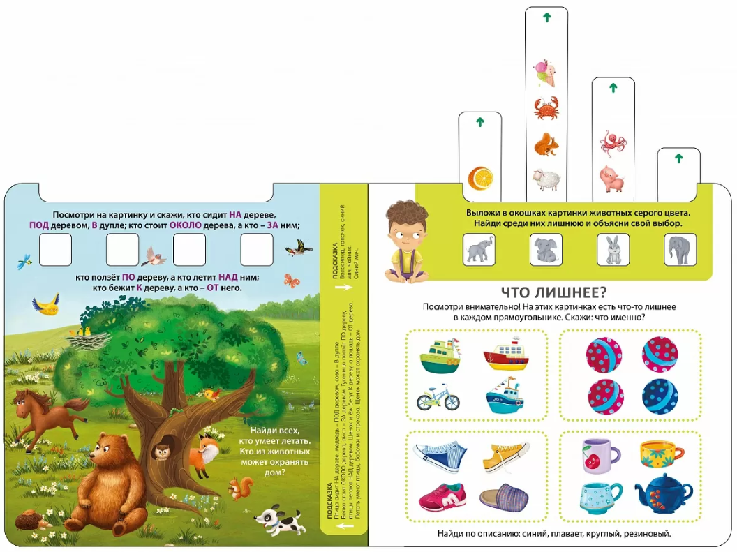 На каждом развороте красочные картинки и интересные задания: найди нелепицы, лишние картинки, обобщать одним словом, использовать правильные предлоги, описать положение в пространстве и свойства предметов и т. п.
