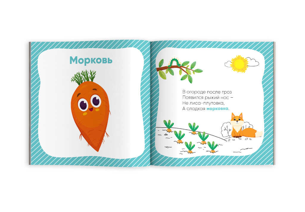 В возрасте одного-двух лет ребёнок начинает активно изучать окружающий мир. Крупные и яркие иллюстрации помогут малышу запомнить, как называются фрукты и овощи. Занятия развивают слуховое восприятие и речь малыша, расширяют его кругозор.