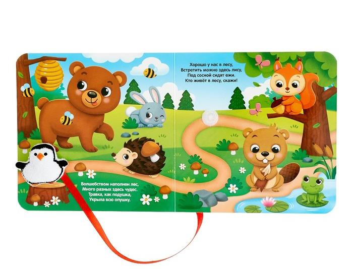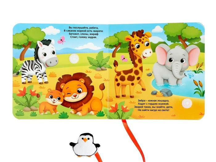 Книга уникальна тем, что в наборе есть мягкая игрушка на ленточке. Малыш сможет прикреплять её на странички с помощью липучек. Скорее отправьте маленького пингвинёнка в увлекательное путешествие!