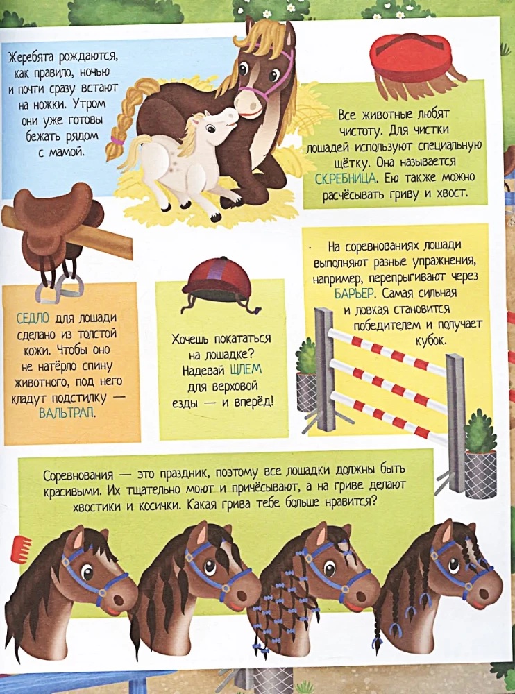 С помощью этой книжки ребёнок узнает много интересного о лошадях и верховой езде.