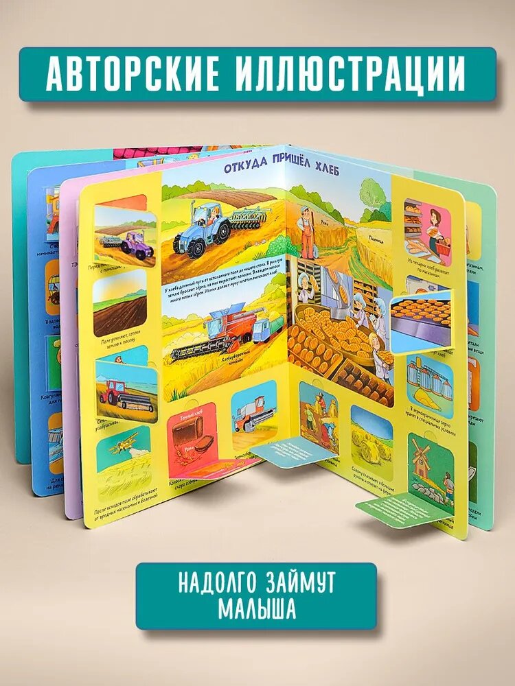 Это познавательная мини-энциклопедия для маленьких почемучек,которые задают миллион вопросов об окружающих их вещах.Книжка с окошками расскажет о том,как построить прочный и теплый дом,откуда берется электричество,чем оно полезно и чем опасно.Малыши узнают,сколько труда нужно,чтобы вырастить зерно и испечь хлеб,как и из чего шьют одежду.