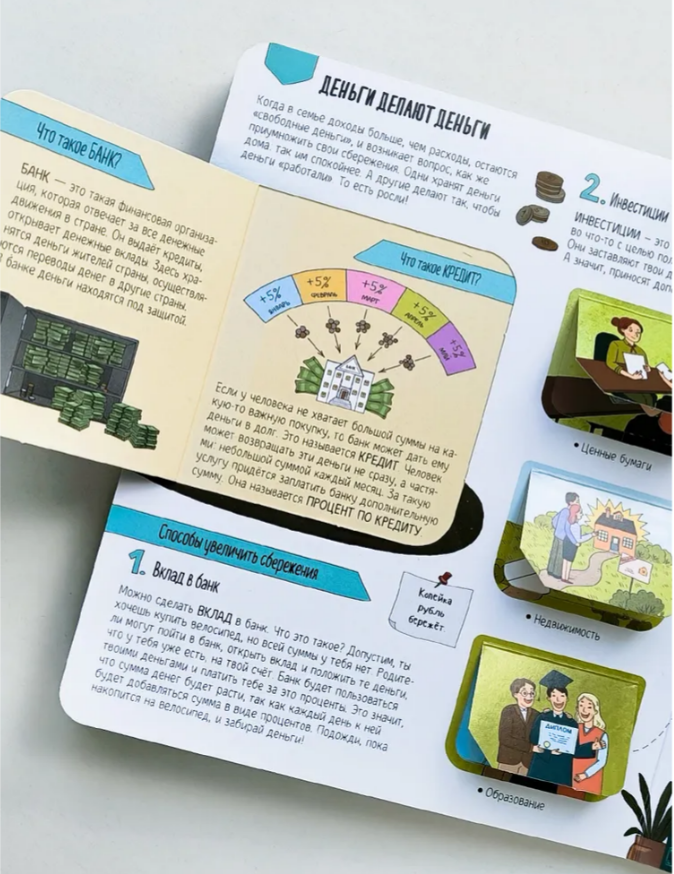 Книжка с окошками «Откуда берутся деньги?» — первый гид для малыша по финансовой грамотности. Она поможет ребёнку понять, что такое деньги и для чего они нужны, узнать о доходах и расходах, о том, что такое банк и как правильно расходовать карманные деньги. В книге 45 окошек с интересными фактами, раскрывающими и дополняющими темы. В этой книге мы постарались в доступной форме рассказать, как финансовая грамотность важна для воспитания успешного человека. Книжка игрушка с множеством открывающихся окошек будет интересна мальчикам и девочкам. Книги для детей предназначены для развития речи и памяти, внимания и усидчивости. Энциклопедия для детей отлично подойдет в качестве обучающего пособия для занятий юных финансистов в детском саду или младших классах школы. Финансовый ликбез для детей. Читайте книжку вместе с вашим ребенком — проводите время с пользой. Книга выполнена из мелованного картона с ламинированной обложкой. Энциклопедия приведет в восторг любого ребенка дошкольного и младшего школьного возраста.