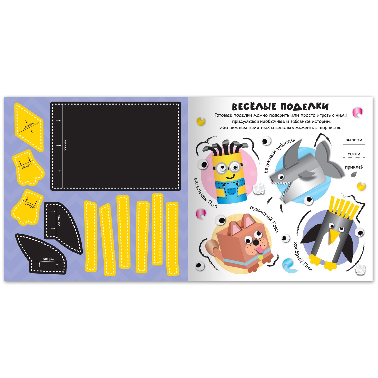С этой творческой книгой можно сделать целых 8 забавных поделок, которых можно «оживить» с помощью самоклеящихся глазок. Будет весело!