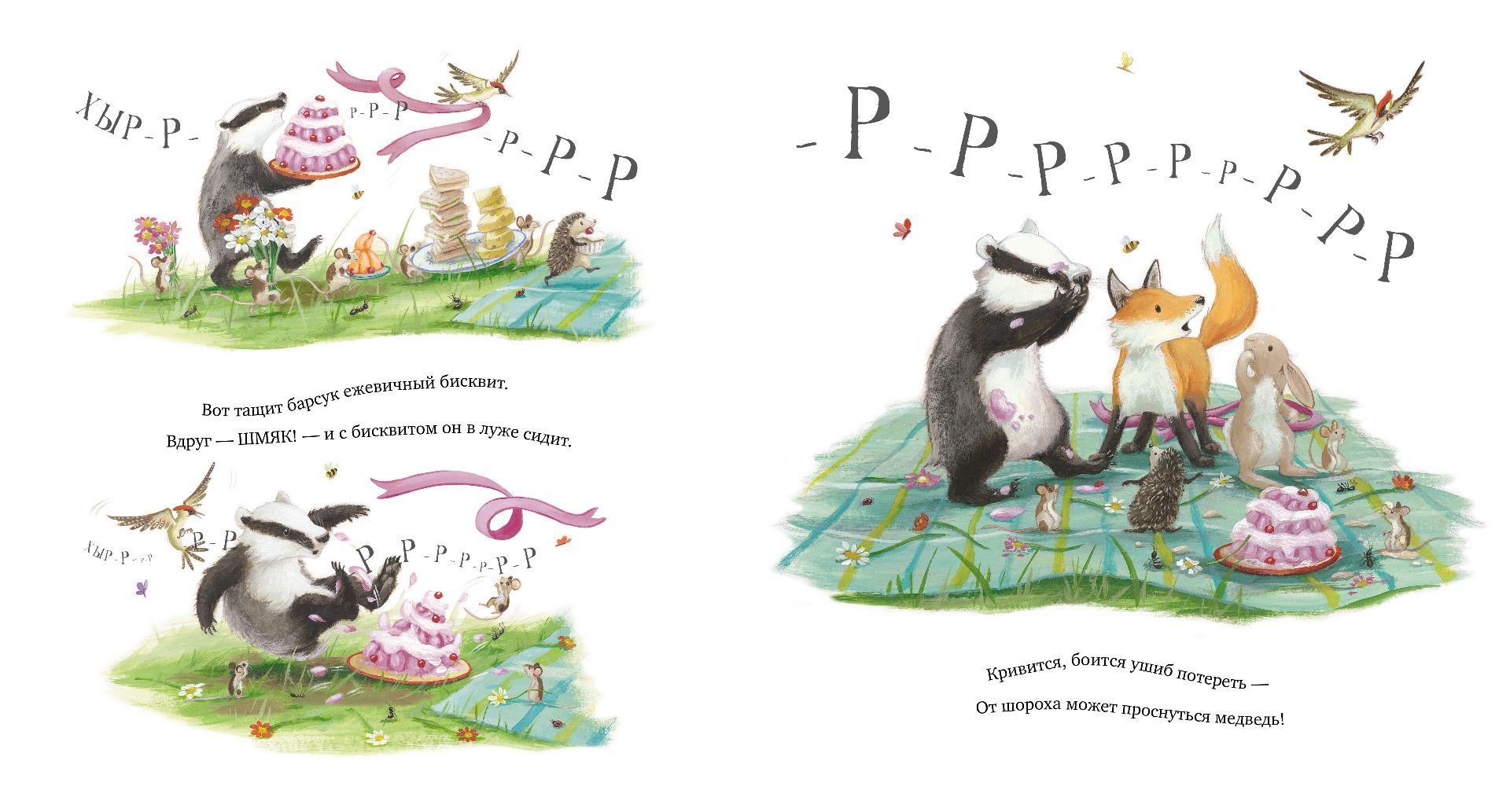 Сегодня весенний пикник состоится. Тогда почему и барсук, и лисица, и дятел, и ёж, и пятёрка мышат у старой колоды от страха дрожат? Лесные звери готовятся к весеннему пикнику, но им приходится ходить на цыпочках. Но кое-кто всё равно устроил шумную заварушку! Ой-ой-ой, кажется, они разбудили медведя!