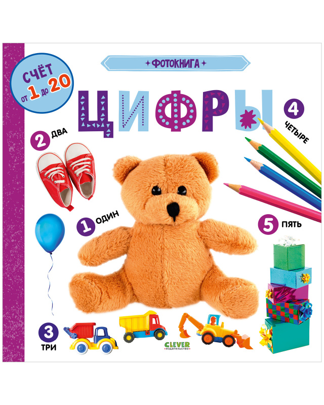 На каждом развороте фотокниги «Цифры» малыш будет знакомиться с новым числом, обводить пальчиком контуры крупных цифр по стрелкам, играть в «найди и покажи», отыскивая и считая заданные предметы и отвечать на вопросы. Кроме того, ребенок повторит формы и цвета.