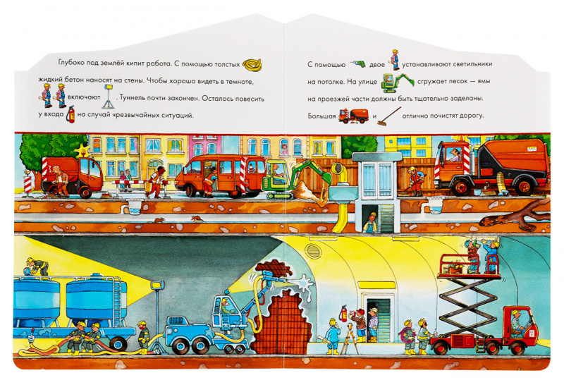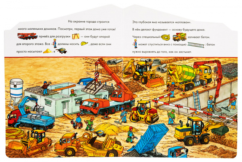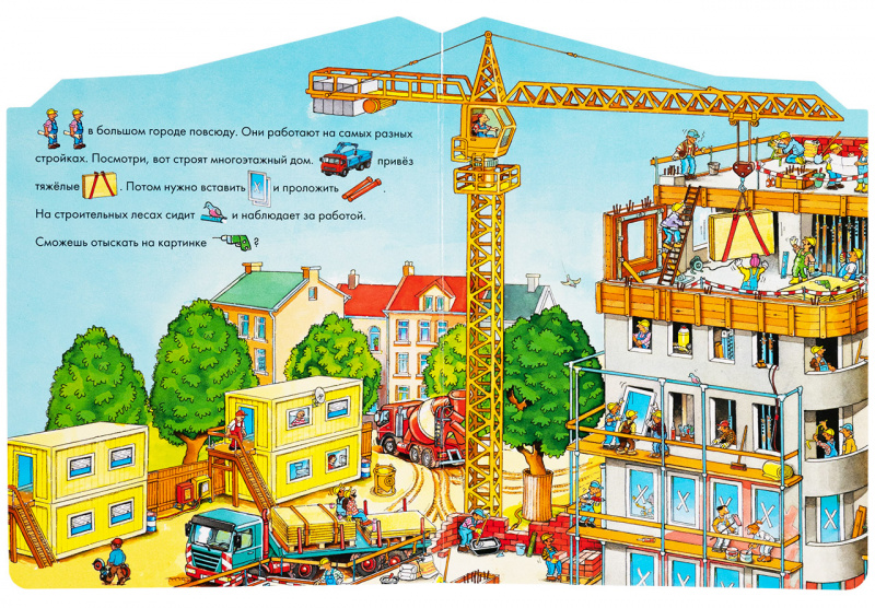 Читайте историю, а малыш будет дополнять ее словами по картинкам-подсказкам. Потом рассматривайте большие разворотные иллюстрации и ищите на них интересные детали: дорожный знак на аварийном участке дороги, дрель на строительной площадке и т.д. Игра «найди и покажи» эффективно развивает память, логику и сообразительность.