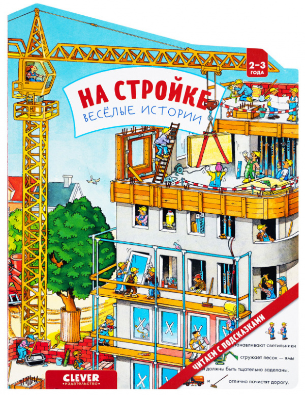 В книжке «На стройке. Веселые истории» фигурная вырубка, очень плотные страницы (толщина более 2 мм, не погнутся и не испортятся), яркие иллюстрации и окошки на обложке, что делает ее прекрасным подарком малышу 2–3 лет. А еще специально для вас мы на всякий случай подготовили подсказки, размещенные по QR-коду.