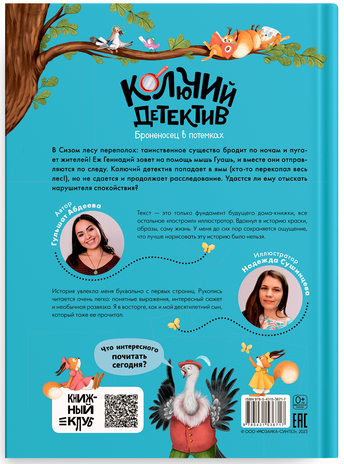 Книга «Колючий детектив. Броненосец в потемках» серии «Книжный клуб. Почитаем вместе?» — про неутомимого детектива ежа по имени Геннадий и его напарницу мышь Гуашь. История, наполненная загадками, лихими сюжетными поворотами и юмором.