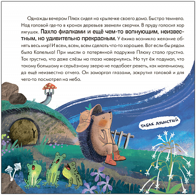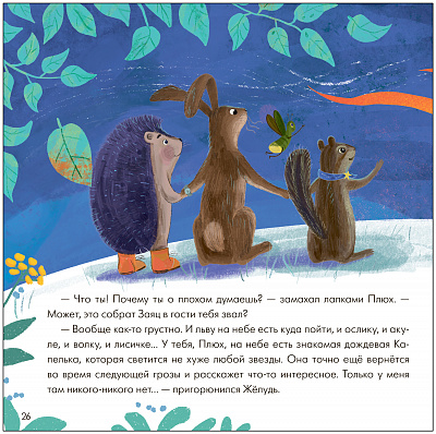 Однажды вечером ежик Плюх сидел на крылечке своего дома и смотрел на звезды. Вскоре к нему в гости пришли друзья: бурундук Желудь и заяц Прыг-Скок. Вместе они стали рассуждать о том, какие бывают планеты и созвездия, что такое метеориты и почему во время звездопада загадывают желания. Приглашаем отыскать на страницах книги ответы на эти интересные вопросы вместе с героями.