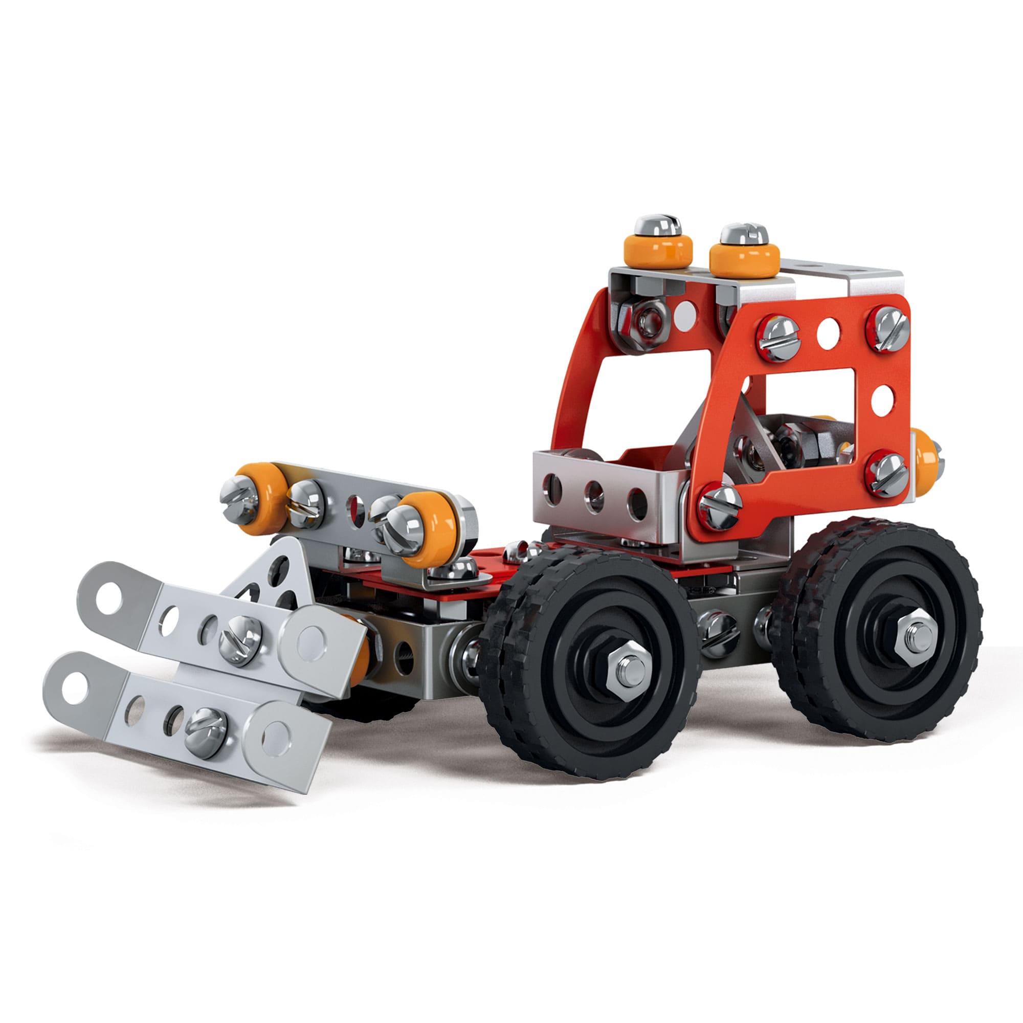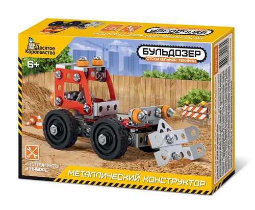 Из комплектующих этого металлического конструктора можно собрать Бульдозер. В процессе сборки ребёнок познакомится с основами моделирования, конструирования и интересно проведет время. Благодаря подвижным элементам, в машину будет интересно играть. Процесс сборки развивает логическое и пространственное мышление, усидчивость, мелкую моторику рук и фантазию.