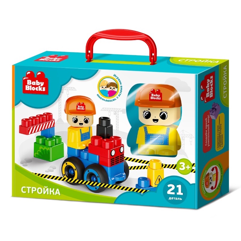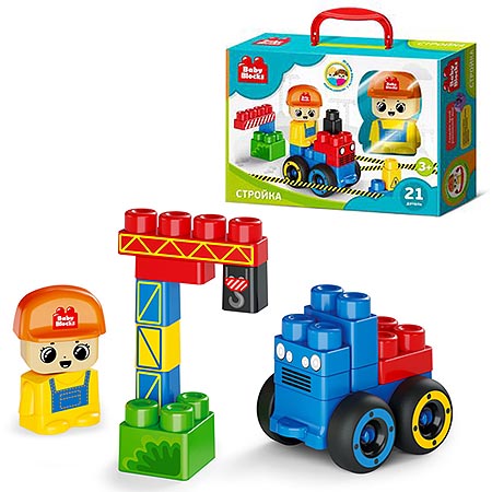 Набор «На стройке». Состав набора: 21 пластиковый элемент, лист с наклейками, буклет со схемами сборки. Материалы: пластмасса, бумага. Размер деталей: от 31*31*52мм до 156*52*103мм. Первый конструктор для малыша – это не только яркая игрушка, но и эффективный тренажёр мелкой моторики рук, логики и фантазии ребёнка.