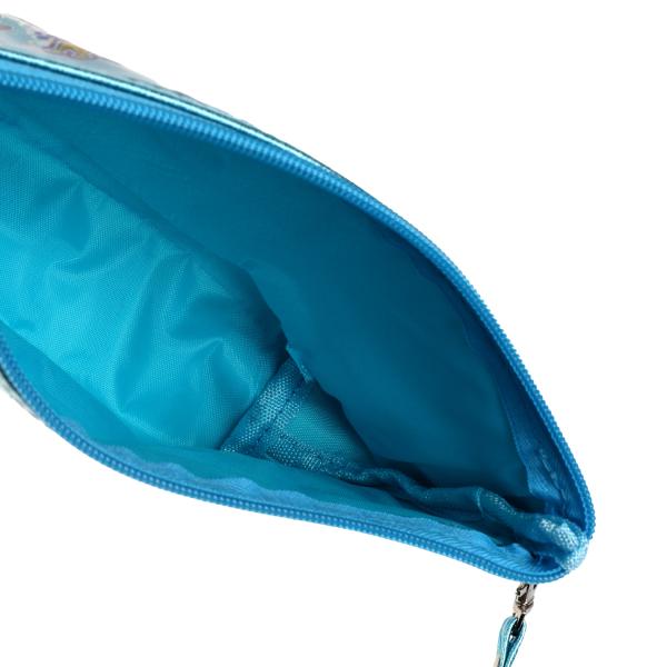 Переливающаяся на свету косметичка с сияющими блёстками и изображением любимых кукол не оставит маленькую принцессу равнодушной. Девочке будет удобно хранить в ней свои украшения или косметику, а благодаря изящному наручному ремешку, её можно носить с собой как сумочку-клатч.