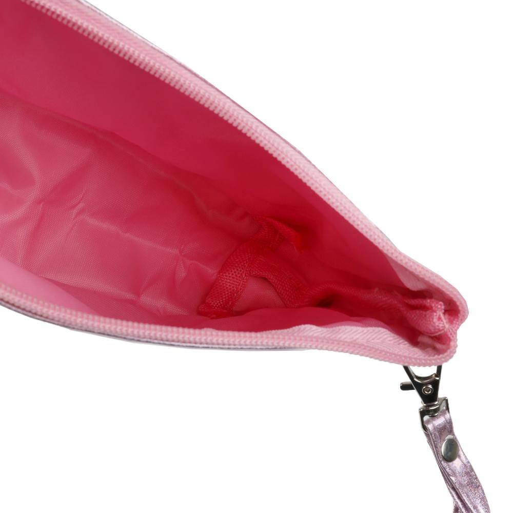 Переливающаяся на свету косметичка с сияющими блёстками и изображением любимых кукол не оставит маленькую принцессу равнодушной. Девочке будет удобно хранить в ней свои украшения или косметику, а благодаря изящному наручному ремешку, её можно носить с собой как сумочку-клатч.