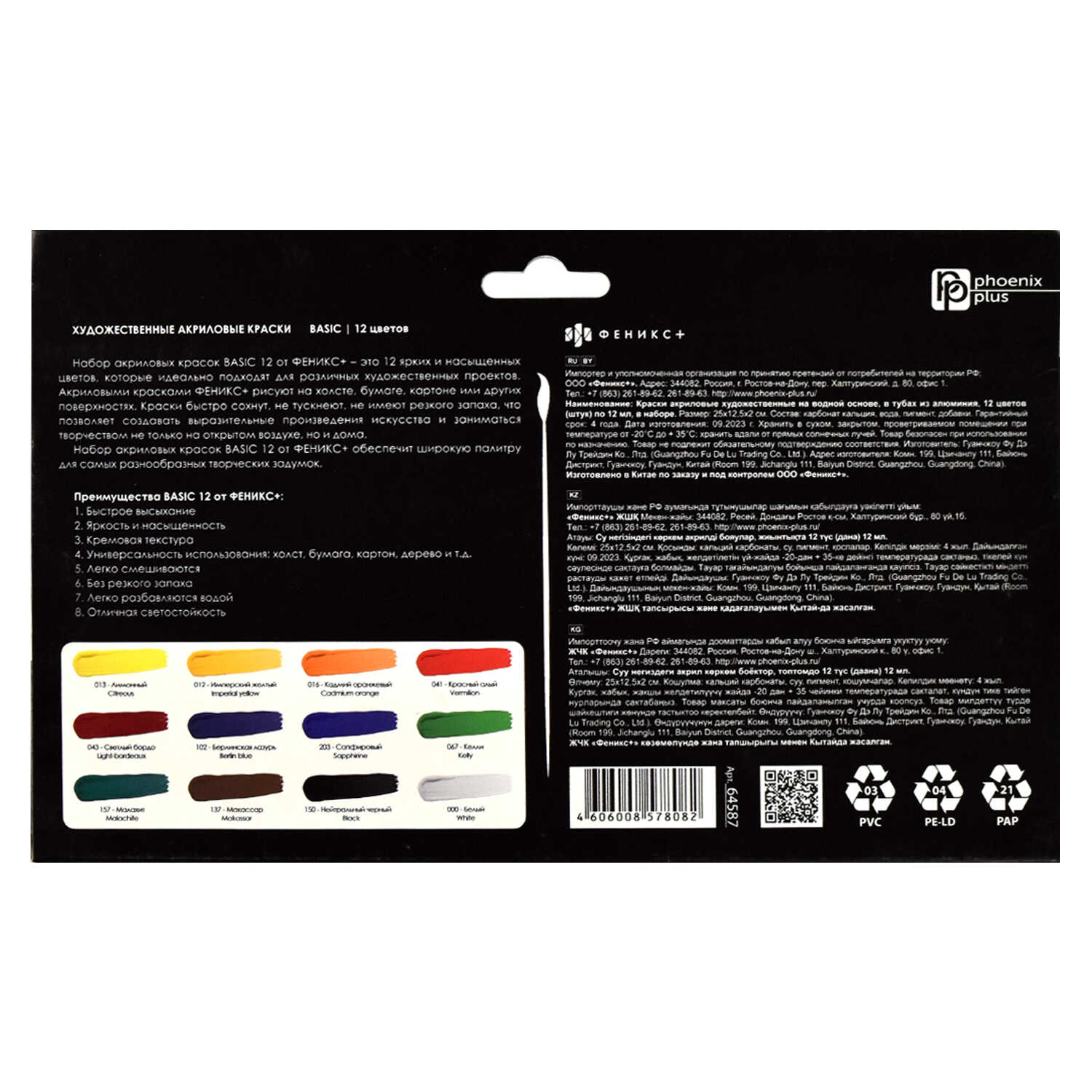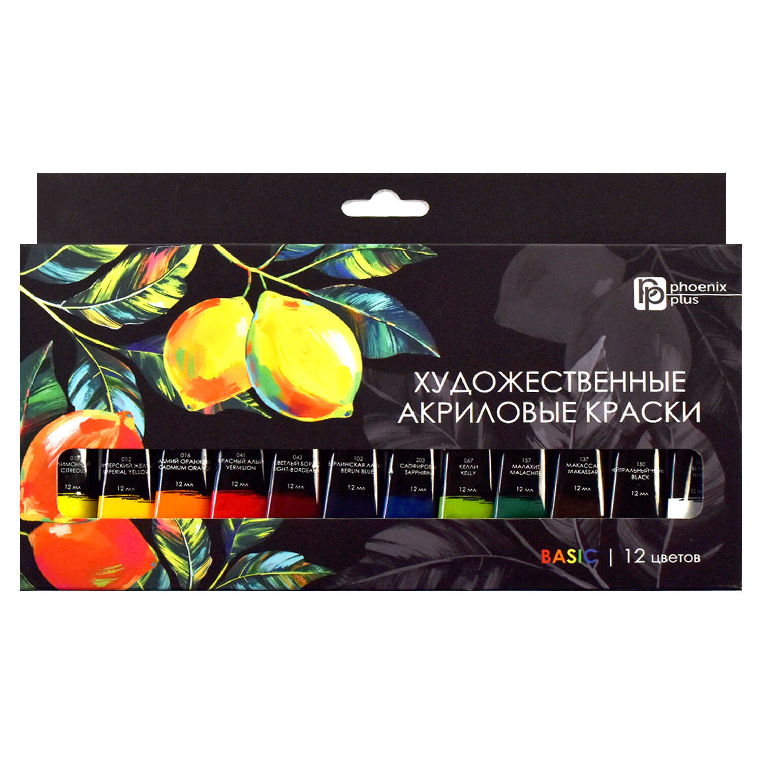Краски акриловые Феникс+ арт. 64587/ 12 ЛИМОНЫ (25x12,5x2 см, 12 цветов, 12 мл, классические цвета, картонная коробка).