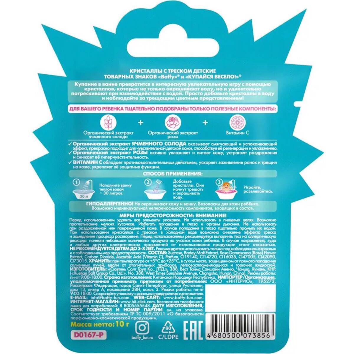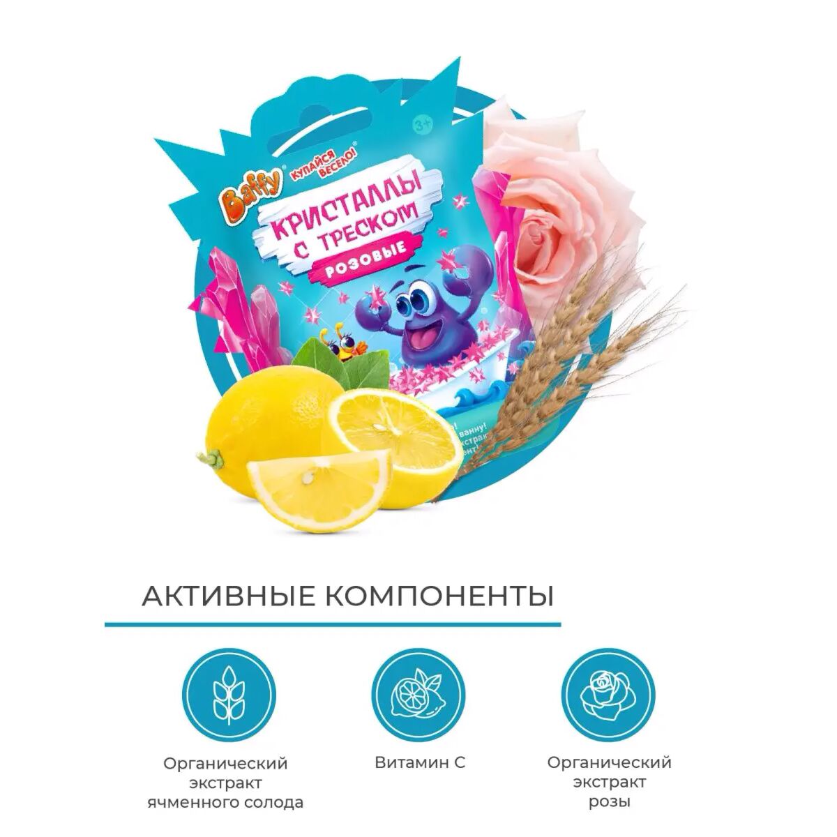 В составе кристаллов тщательно подобранные и только ПОЛЕЗНЫЕ компоненты: Органический экстракт ЯЧМЕННОГО СОЛОДА оказывает смягчающий и успокаивающий эффект, прекрасно подходит для чувствительной детской кожи, способствуя её регенерации и увлажнению.