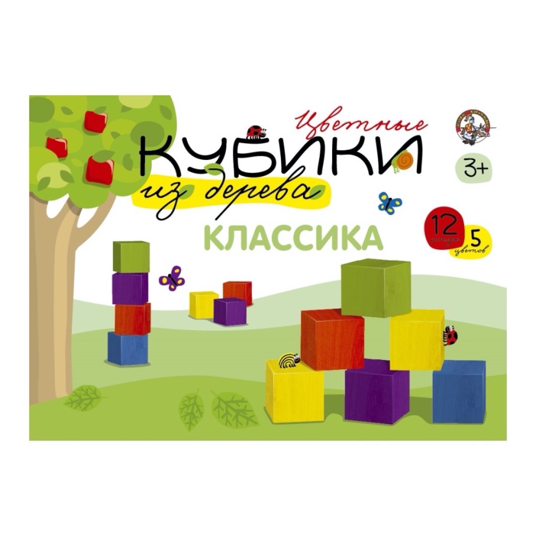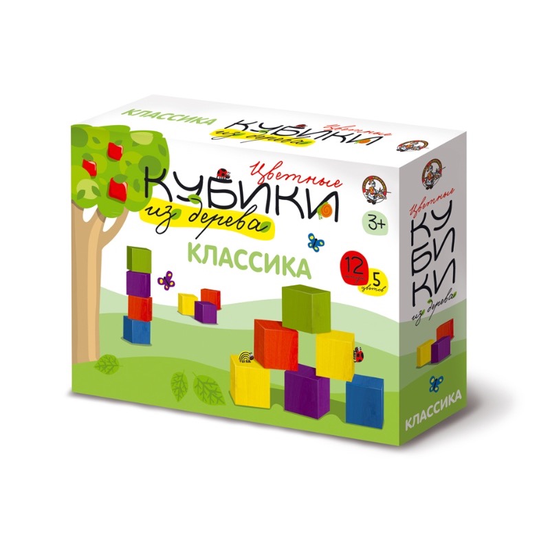 Набор представляет собой 12 приятных на ощупь, хорошо отшлифованных кубиков из массива вятской березы, окрашенных в пять цветов немецкими водными красками для детских игрушек.