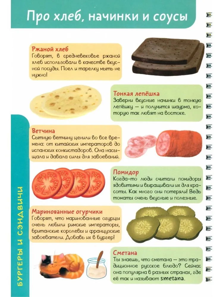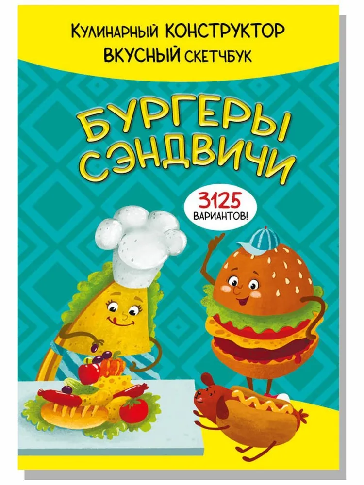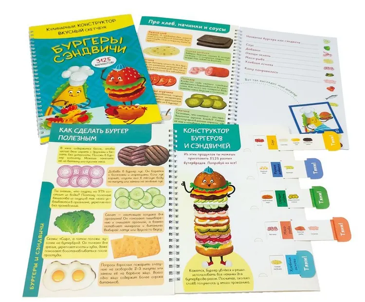 Детская поваренная книга и блокнот для записи рецептов в одном издании. Уникальные кулинарные конструкторы помогут каждый день создавать новое блюдо из продуктов, которые есть под рукой. Фантазируй, записывай лучшие рецепты и рисуй любимые блюда на страницах скетчбука.Уникальный скейтчбук, не имеющих аналогов на рынке будет инетерсен как детям так и взрослым. Всего одна страница хранит в себе невероятное количество варинтов приготовления: 3125 - бургеров и сэндвичей. Самые любимые рецепты можно так же зафиксировать в нем. 172х250, Блокнот на пружине, обложка - картон, блок-конструктор - картон, блок 20л. для записей рецепта - офсет, пружина