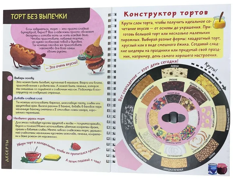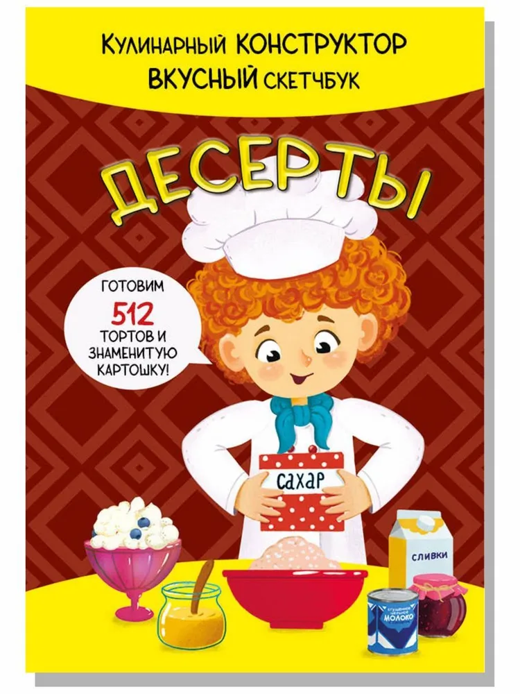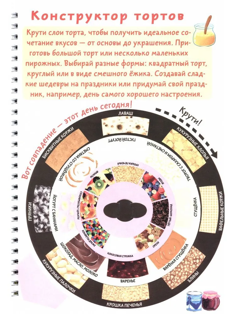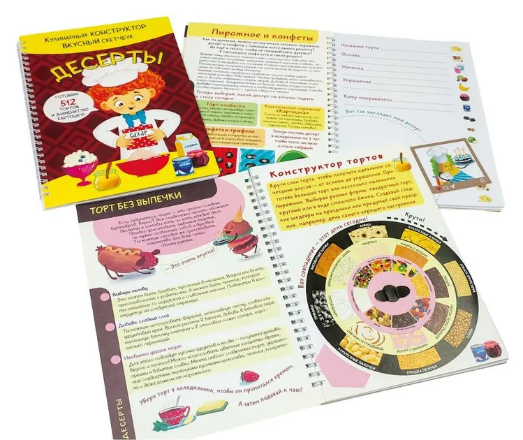 Детская поваренная книга и блокнот для записи рецептов в одном издании. Уникальные кулинарные конструкторы помогут каждый день создавать новое блюдо из продуктов, которые есть под рукой. Фантазируй, записывай лучшие рецепты и рисуй любимые блюда на страницах скетчбука.Уникальный скейтчбук, не имеющих аналогов на рынке будет инетерсен как детям так и взрослым. Всего одна страница хранит в себе невероятное количество варинтов приготовления: 512 - десертов. Самые любимые рецепты можно так же зафиксировать в нем. 172х250, Блокнот на пружине, обложка - картон, блок-конструктор - картон, блок 20л. для записей рецепта - офсет, пружина