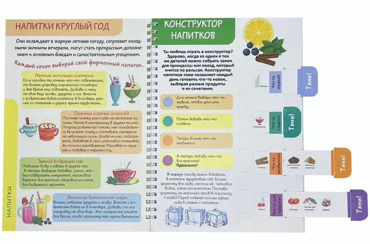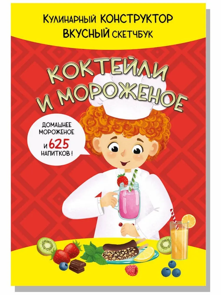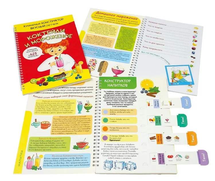 Детская поваренная книга и блокнот для записи рецептов в одном издании. Уникальные кулинарные конструкторы помогут каждый день создавать новое блюдо из продуктов, которые есть под рукой. Фантазируй, записывай лучшие рецепты и рисуй любимые блюда на страницах скетчбука. Уникальный скейтчбук, не имеющих аналогов на рынке будет инетерсен как детям так и взрослым. Всего одна страница хранит в себе невероятное количество варинтов приготовления: 625 - напитков. Самые любимые рецепты можно так же зафиксировать в нем. 172х250, Блокнот на пружине, обложка - картон, блок-конструктор - картон, блок 20л. для записей рецепта - офсет, пружина