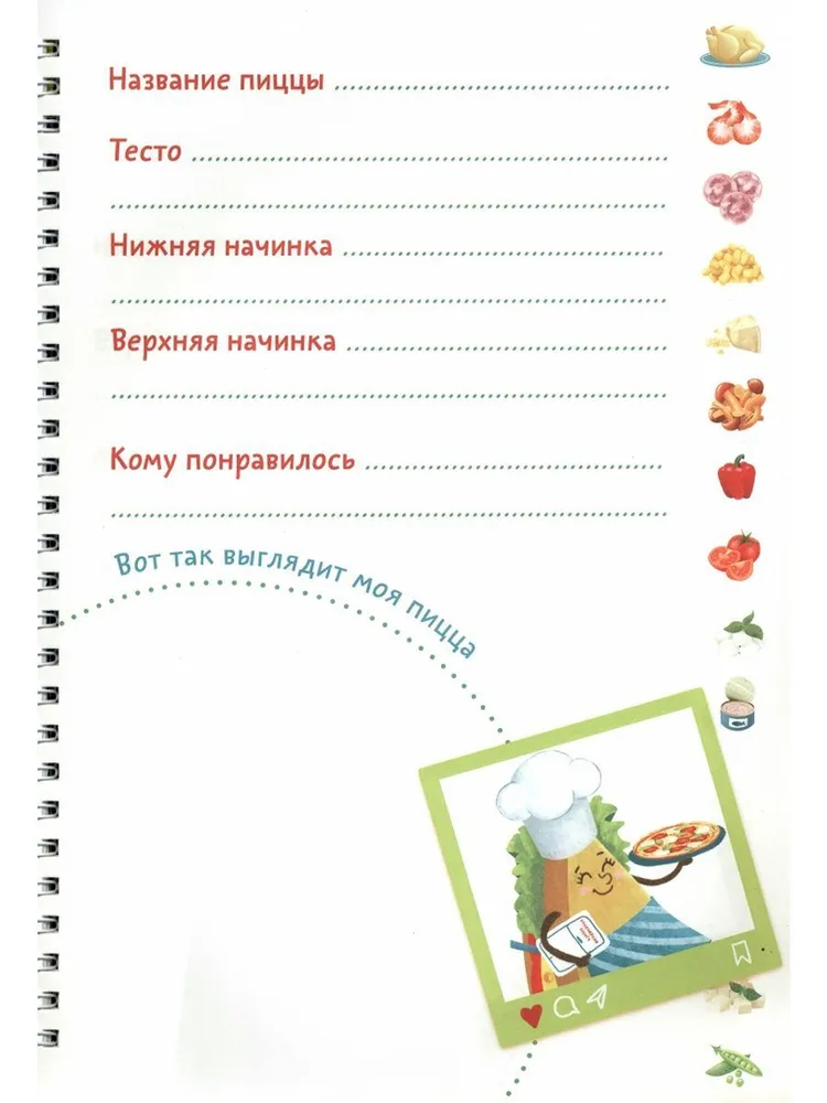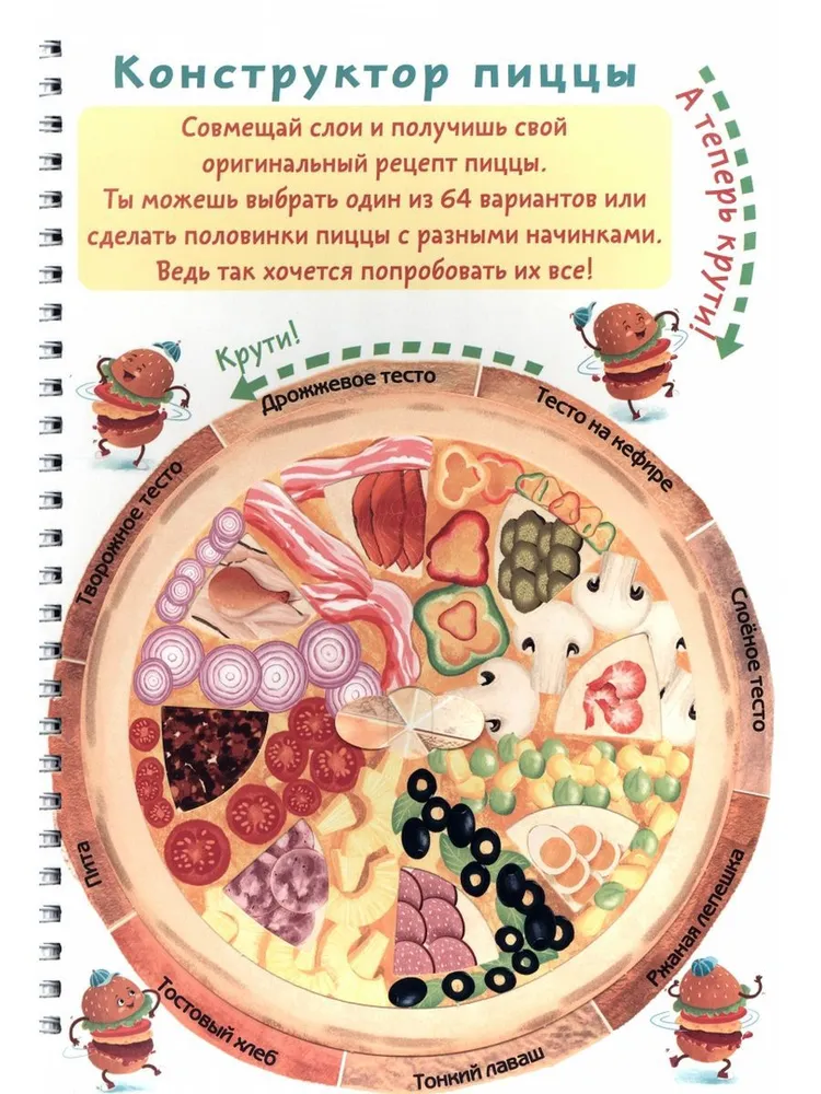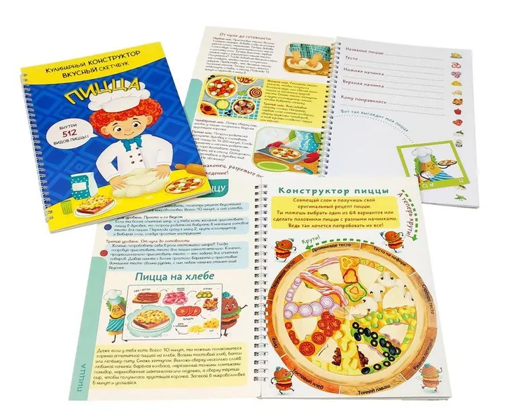 Детская поваренная книга и блокнот для записи рецептов в одном издании. Уникальные кулинарные конструкторы помогут каждый день создавать новое блюдо из продуктов, которые есть под рукой. Фантазируй, записывай лучшие рецепты и рисуй любимые блюда на страницах скетчбука. Уникальный скейтчбук, не имеющих аналогов на рынке будет инетерсен как детям так и взрослым. Всего одна страница хранит в себе невероятное количество варинтов приготовления: 512 - пиццы. Самые любимые рецепты можно так же зафиксировать в нем. 172х250, Блокнот на пружине, обложка - картон, блок-конструктор - картон, блок 20л. для записей рецепта - офсет, пружина
