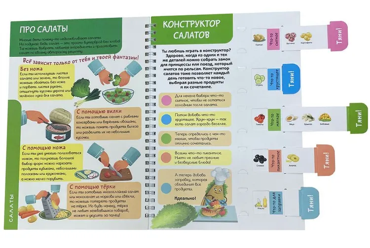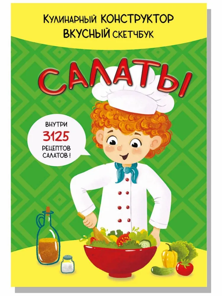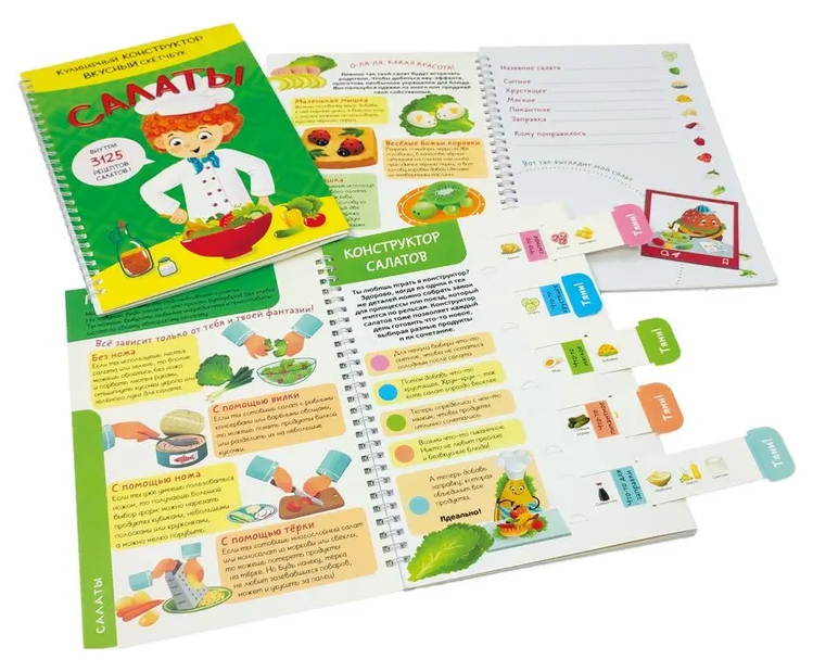 Детская поваренная книга и блокнот для записи рецептов в одном издании. Уникальные кулинарные конструкторы помогут каждый день создавать новое блюдо из продуктов, которые есть под рукой. Фантазируй, записывай лучшие рецепты и рисуй любимые блюда на страницах скетчбука.Уникальный скейтчбук, не имеющих аналогов на рынке будет инетерсен как детям так и взрослым. Всего одна страница хранит в себе невероятное количество варинтов приготовления: 3125 салатов. Самые любимые рецепты можно так же зафиксировать в нем. 172х250, Блокнот на пружине, обложка - картон, блок-конструктор - картон, блок 20л. для записей рецепта - офсет, пружина.