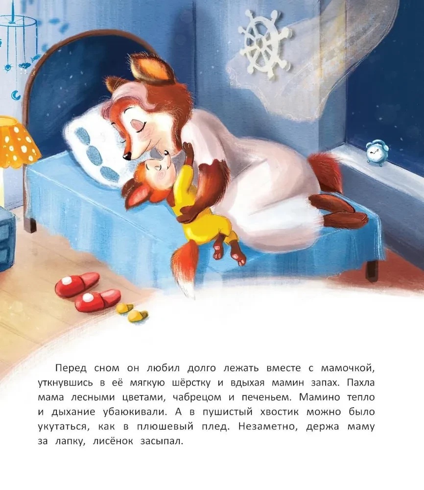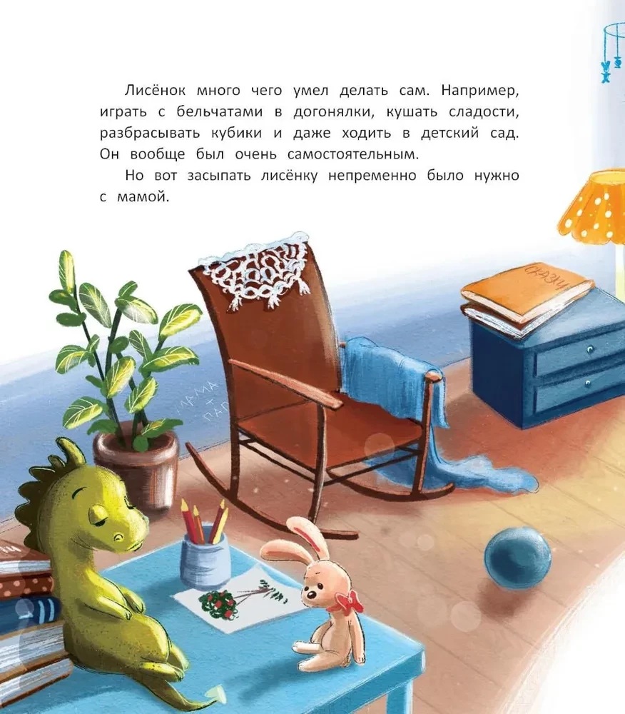 Лисёнок живёт в уютной норке и почти всё умеет делать сам. Всё, кроме одного — засыпать без мамы. Это так сложно! И страшно... И совсем-совсем непривычно! Но мамина любовь и немножко терпения творят чудеса. У лисёнка всё получилось! Он научился спать в своей кроватке сам. Прочитав перед сном нашу книжку, научишься этому и ты!