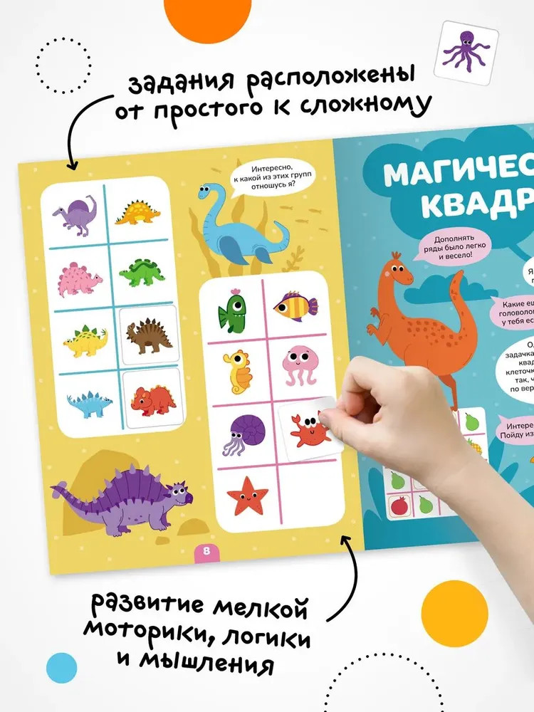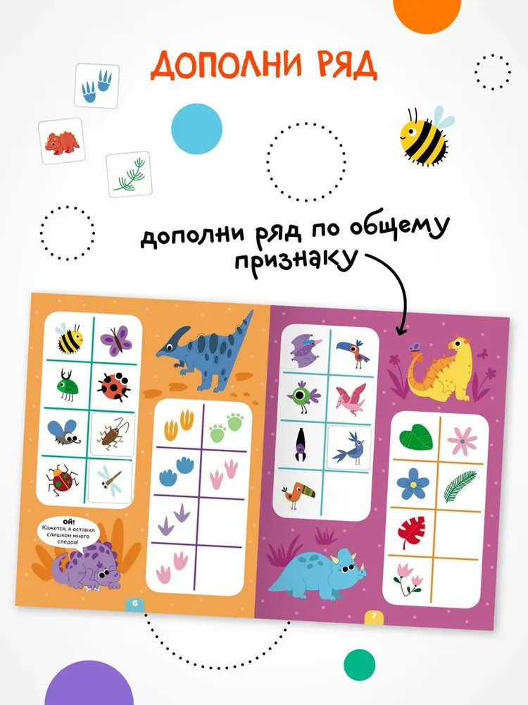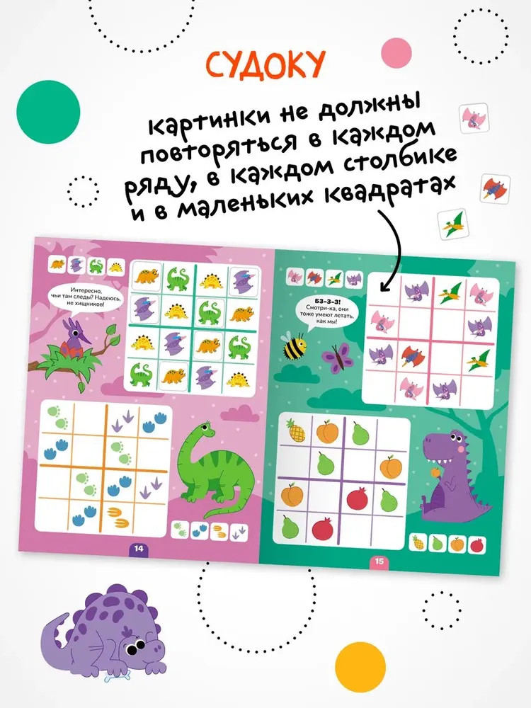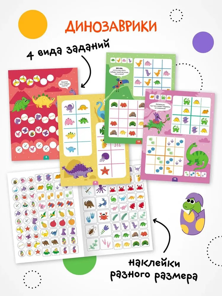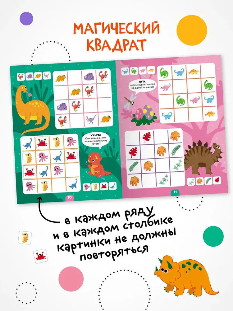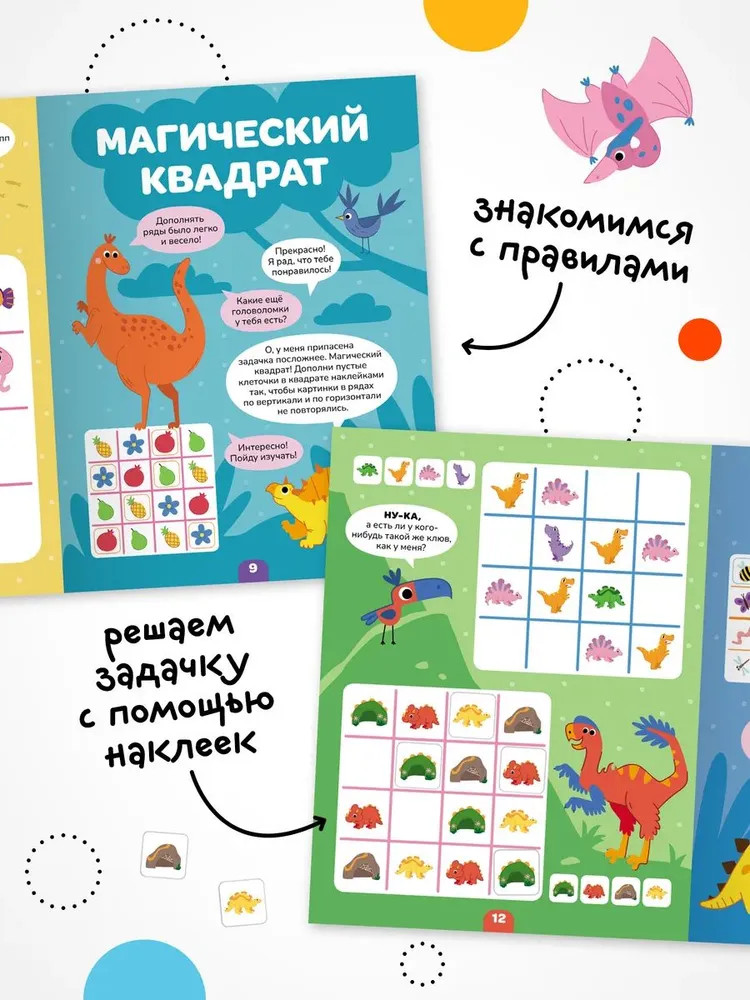Книга «Динозавры» серии «Логика с наклейками» поможет ребенку весело и с пользой провести время, расширить кругозор, потренировать память и логическое мышление. Любимый вид деятельности практически каждого ребенка — клеить наклейки — мы совместили с решением популярных заданий на логику. В каждой книжке четыре вида логических задачек — продолжи ряд, дополни ряд, магический квадрат и судоку. И на каждой страничке ребенка ждут обаятельные динозаврики! Задания адаптированы для детей от 4 лет и расположены от простого к сложному. Для детей помладше может понадобиться помощь взрослого, но начиная с 5 лет ребята уже вполне смогут справиться с заданиями самостоятельно.