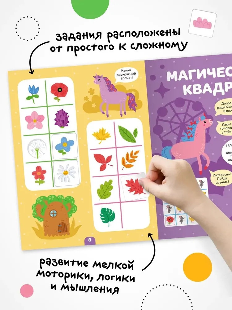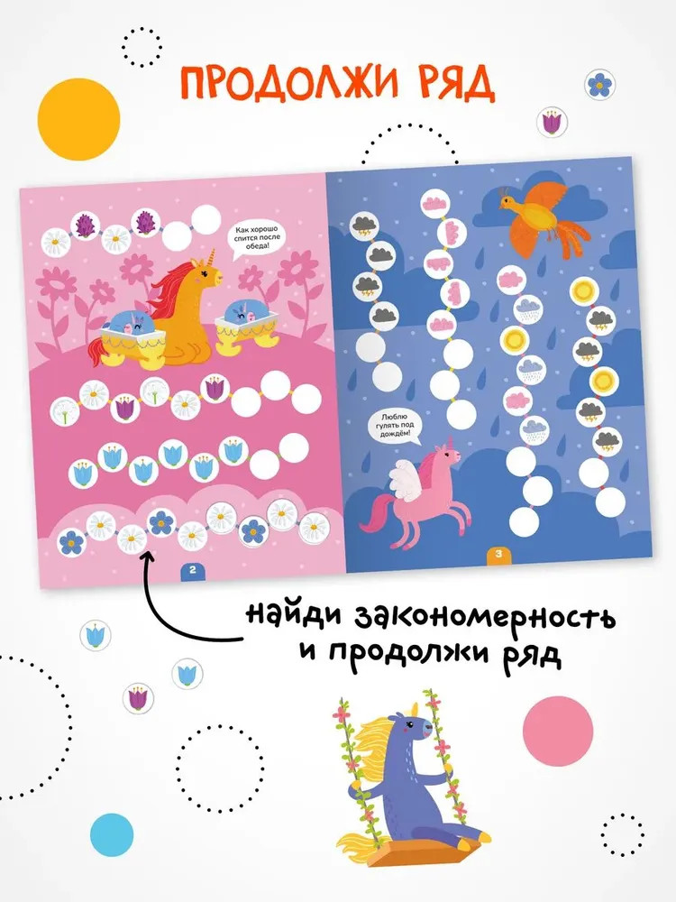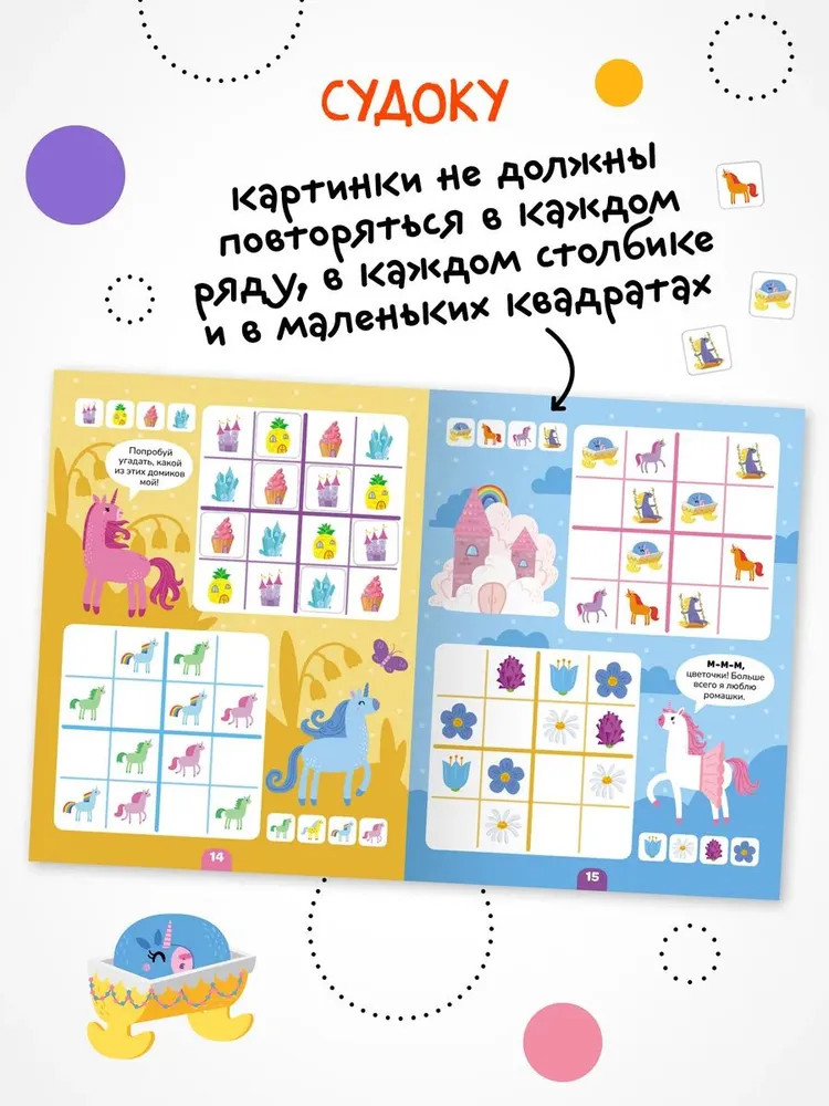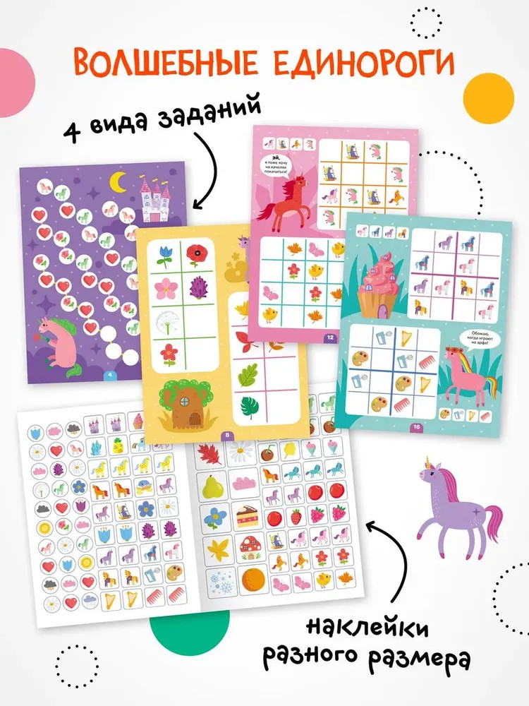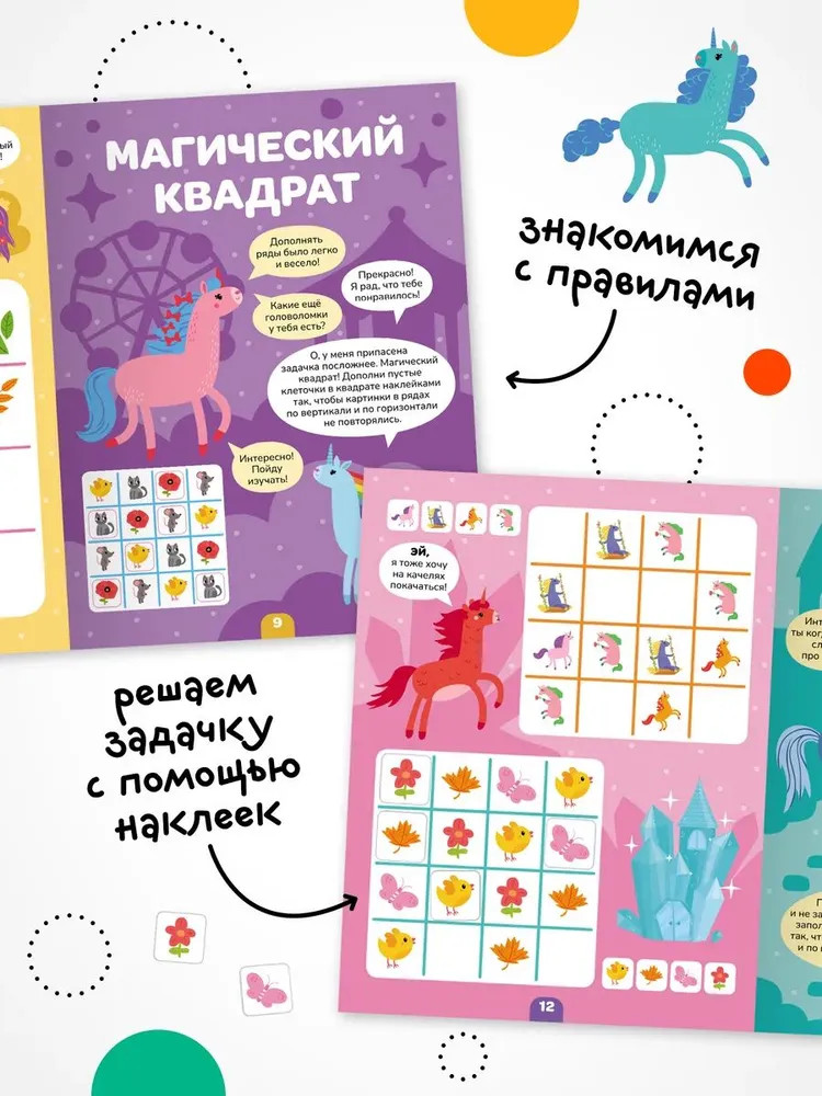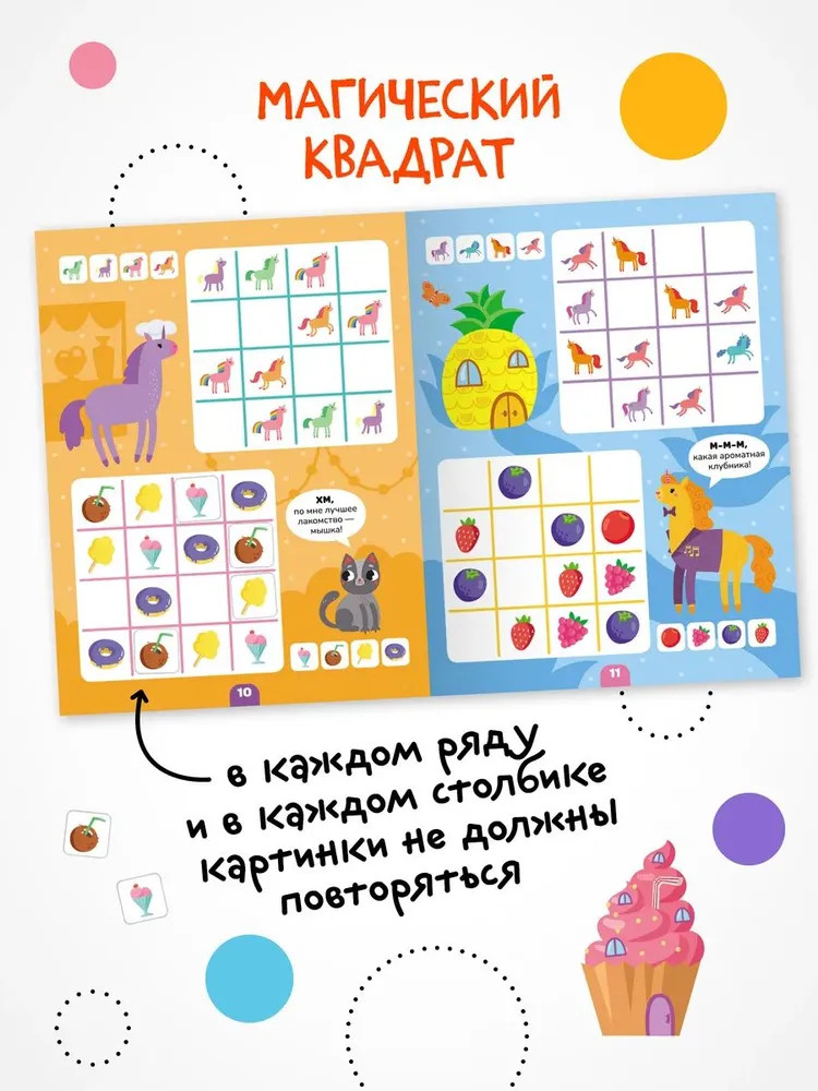 Книга «Единороги» серии «Логика с наклейками» поможет ребенку весело и с пользой провести время, расширить кругозор, потренировать память и логическое мышление. Любимый вид деятельности практически каждого ребенка — клеить наклейки — мы совместили с решением популярных заданий на логику. В каждой книжке четыре вида логических задачек — продолжи ряд, дополни ряд, магический квадрат и судоку. И на каждой страничке ребенка ждут забавные единороги! Задания адаптированы для детей от 4 лет и расположены от простого к сложному. Для детей помладше может понадобиться помощь взрослого, но начиная с 5 лет ребята уже вполне смогут справиться с заданиями самостоятельно.