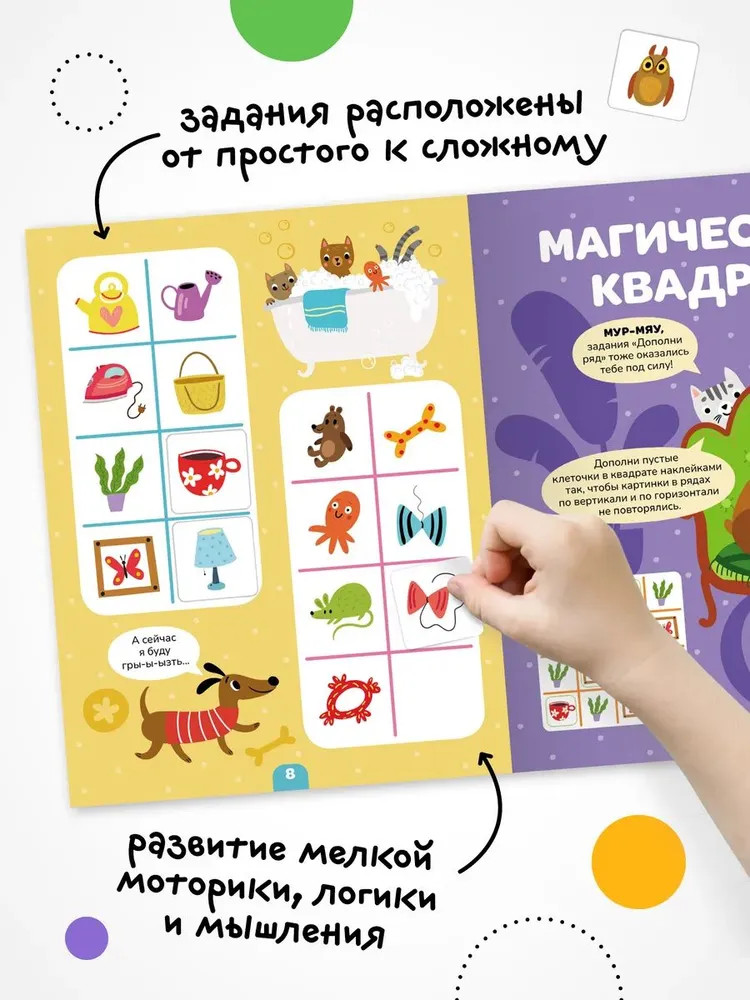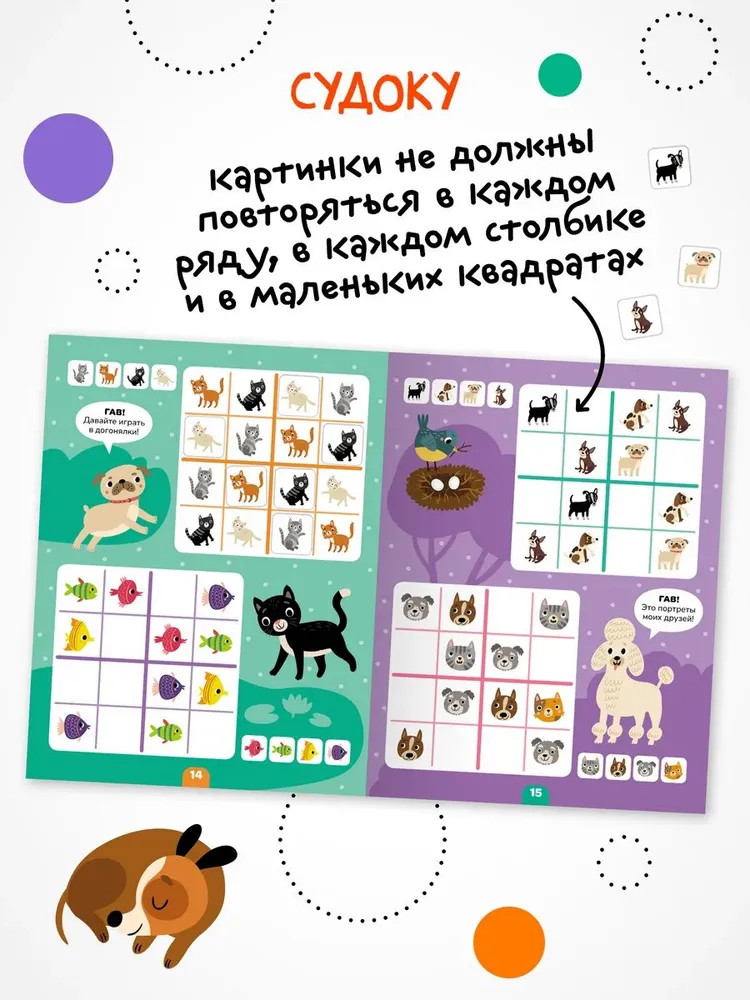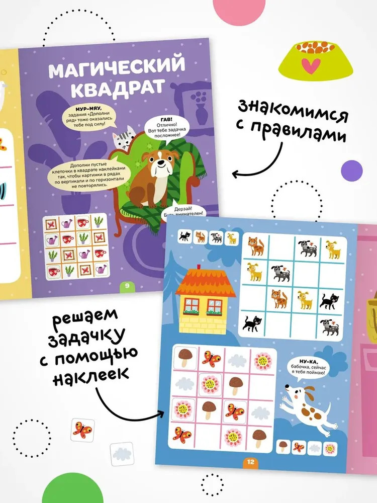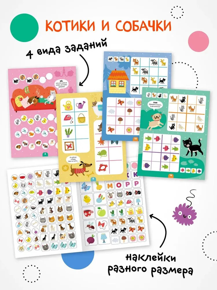 Книга «Котики и собачки» серии «Логика с наклейками» поможет ребенку весело и с пользой провести время, расширить кругозор, потренировать память и логическое мышление. Любимый вид деятельности практически каждого ребенка — клеить наклейки — мы совместили с решением популярных заданий на логику. В каждой книжке четыре вида логических задачек — продолжи ряд, дополни ряд, магический квадрат и судоку. И на каждой страничке ребенка ждут смешные котики и собачки! Задания адаптированы для детей от 4 лет и расположены от простого к сложному. Для детей помладше может понадобиться помощь взрослого, но начиная с 5 лет ребята уже вполне смогут справиться с заданиями самостоятельно.