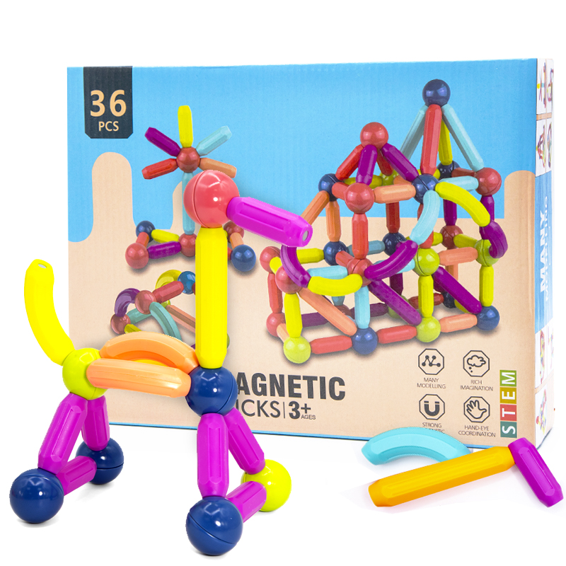 Magnetic Sticks магнитный конструктор - развивающая игрушка для самых маленьких детей. В комплекте есть 36 разноцветных элементов различной формы и окраски. Внутри корпуса из прочного пластика спрятаны и запаяны магниты, что обеспечивает надежность и безопасность. Наличие магнитиков создает постоянное притяжение и способствует хорошей фиксации. Из деталей можно собирать различные фигурки, в красочной инструкции есть множество примеров, и так же объясняется как правильно скреплять детали между собой. Компактные детали удобно помещаются в ручке ребенка. Конструктор ориентирован на развитие воображения, мелкой моторики, логического и пространственного мышления детей.