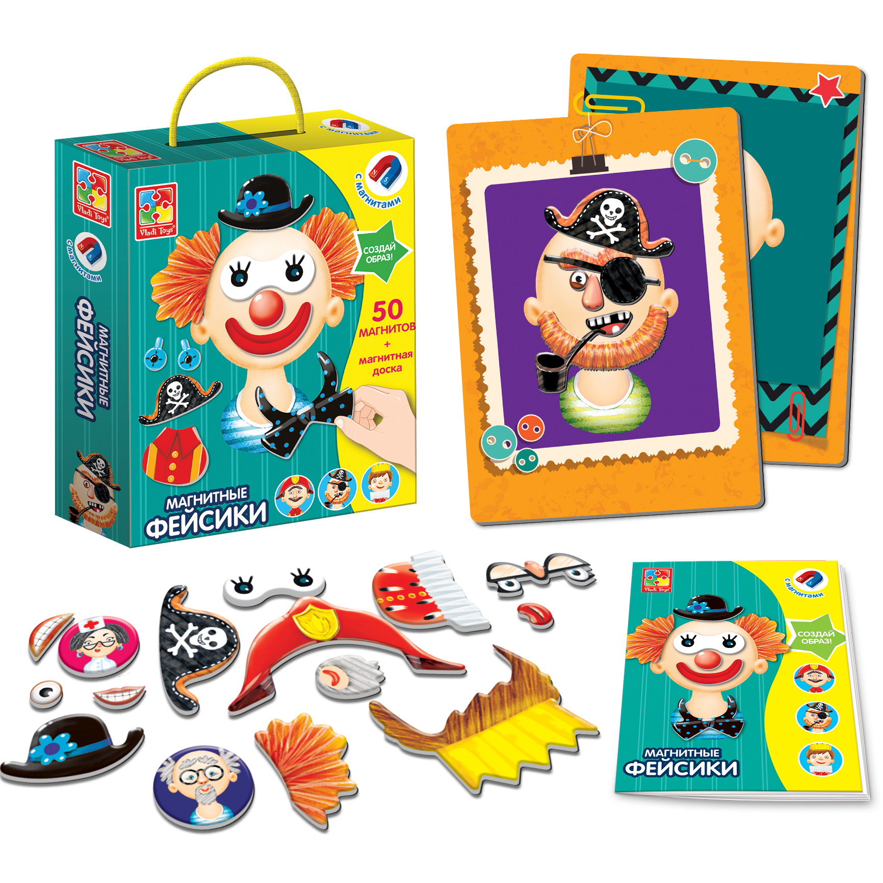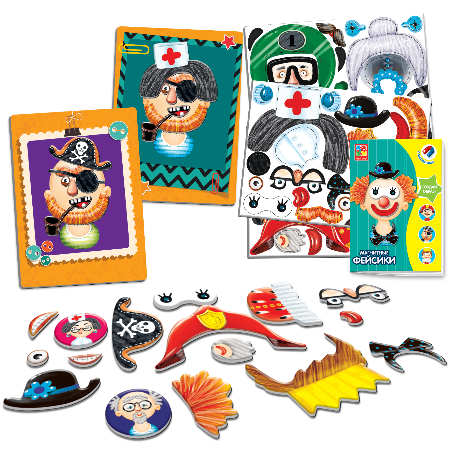 Внимательно рассмотрите наших героев. Для каждого из них есть свои магнитные атрибуты! Подберите правильно аксессуары и по очереди крепите их к фигурке-основе. Например, гонщику нужен шлем, а ученому – очки.
