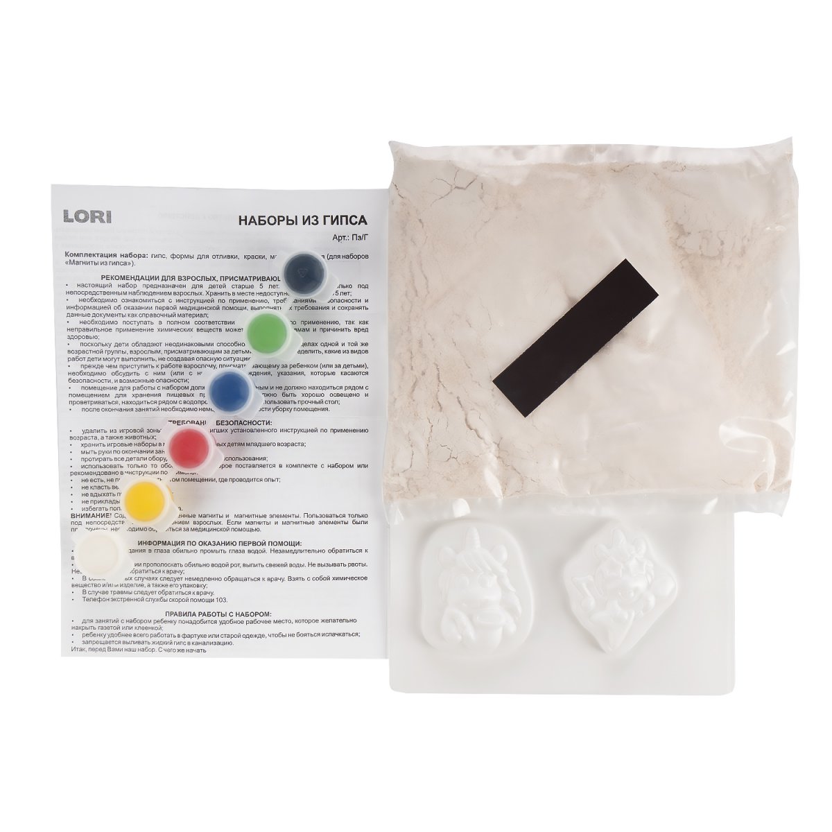 Формы, гипс, краски, магнитная лента, инструкция.