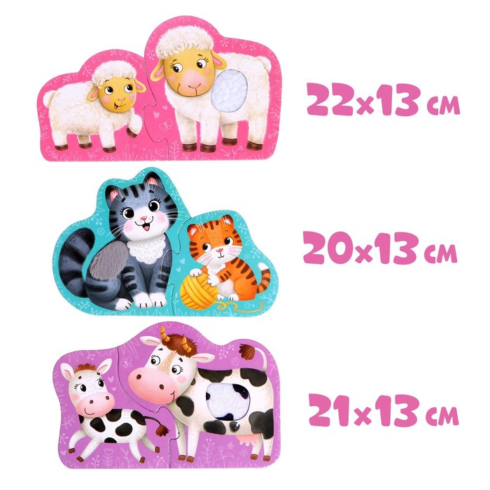 Макси-пазлы с тактильными вставками «Малыши и мамы» — это 6 деталей, из которых ребёнок соберёт 3 разных пазла и познакомится с животными зоопарка. Макси пазлы помогут развить усидчивость, координацию и мелкую моторику рук, а также научат находить связь между частью и целым.