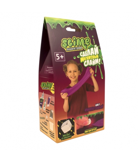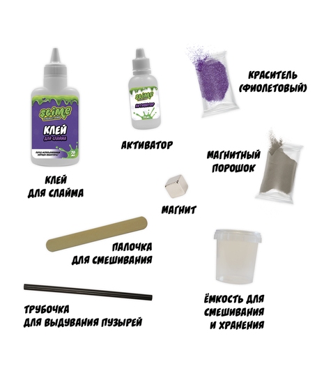 Создай своими руками необыкновенный магнитный слайм, наделённый суперсилой, пластичностью и эластичностью. Из него можно выдувать пузыри, используя трубочку из набора. Если растянуть слайм и поставить под струю воды, завернув уголки, то он сможет держать жидкость как шарик. А если поднести к магнит, то он будет тянуться к нему.