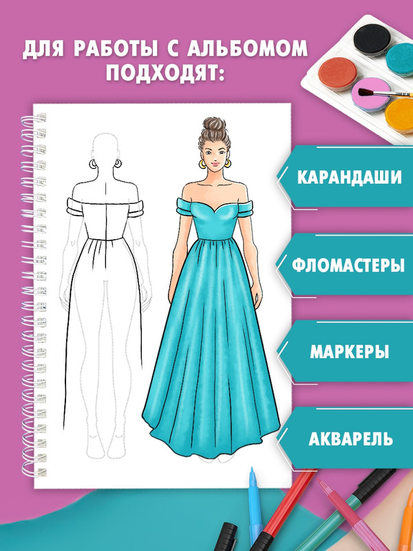 Серия «Модный альбом» — это находка для девочек, девушек, женщин и всех, кто любит рисовать, создавать интересные образы и просто влюблен в моду. Для большего удобства брошюра на гребне, обложка из плотного картона, а листы в блоке из плотной бумаги. Комфортный формат позволит брать альбом с собой куда угодно. В блоке вы найдете 96 силуэтов фигур в точку, благодаря чему создавать дизайн одежды станет очень просто. Модный альбом станет прекрасным подарком на любой праздник. Помогите близким сделать первые шаги в дизайне прямо сейчас!