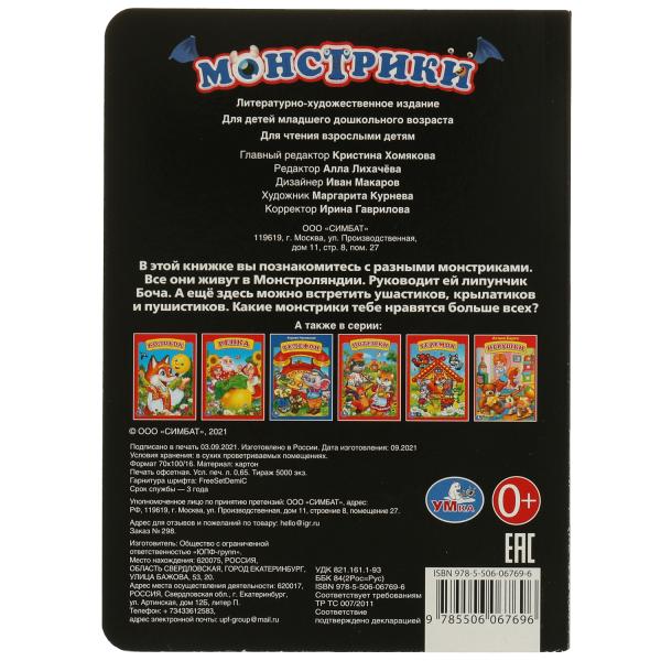 Эта яркая книга познакомит маленького читателя с разными монстриками, которые живут в Монстроляндии. Этой удивительной страной руководит липунчик Боча, а ещё здесь можно встретить ушастиков, крылатиков и пушистиков. Малыш с удовольствием будет разглядывать красочные картинки и слушать удивительную историю про забавных монстриков. Благодаря небольшому размеру книгу удобно брать с собой в дорогу.