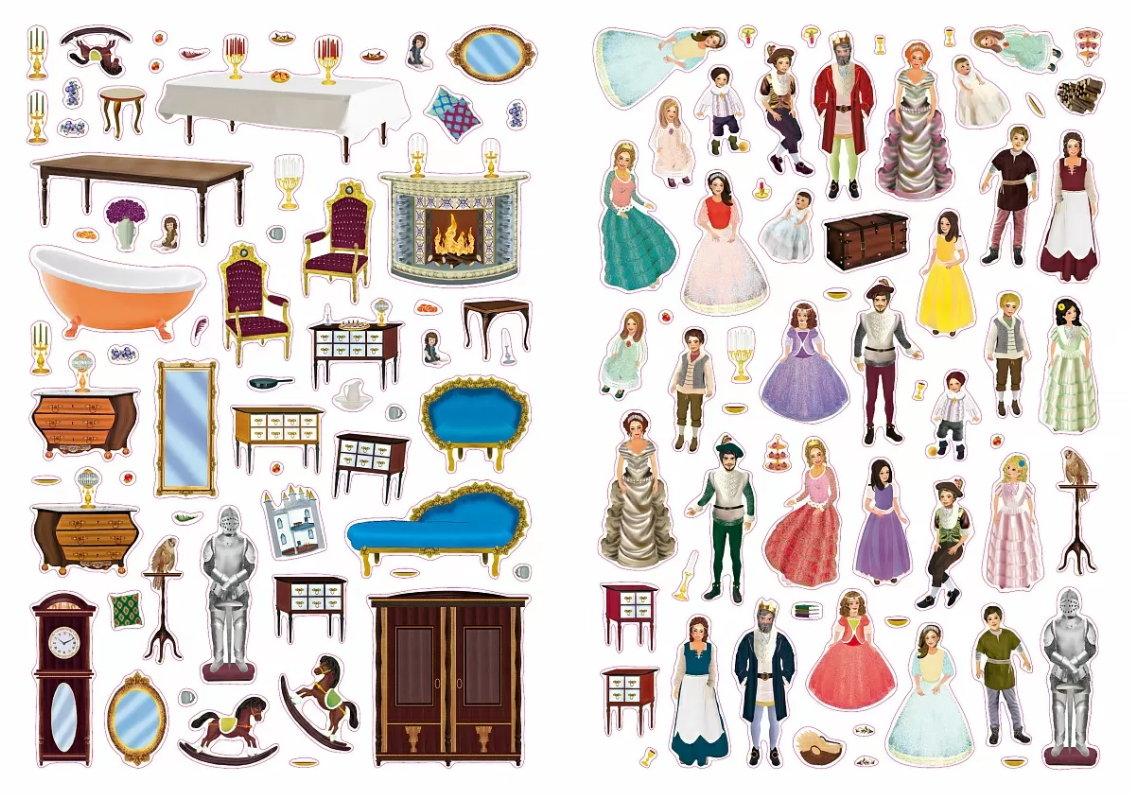Эта книга с наклейками, где можно воплотить в жизнь множество творческих идей: по своему вкусу расставить мебель и предметы интерьера в приёмной, в бальных, спальных и тронных залах. А также поселить во дворец людей.