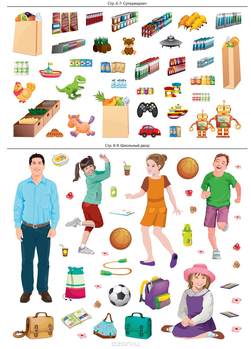 - 8 листов с наклейками, с помощью которых можно воссоздать интересные сюжеты