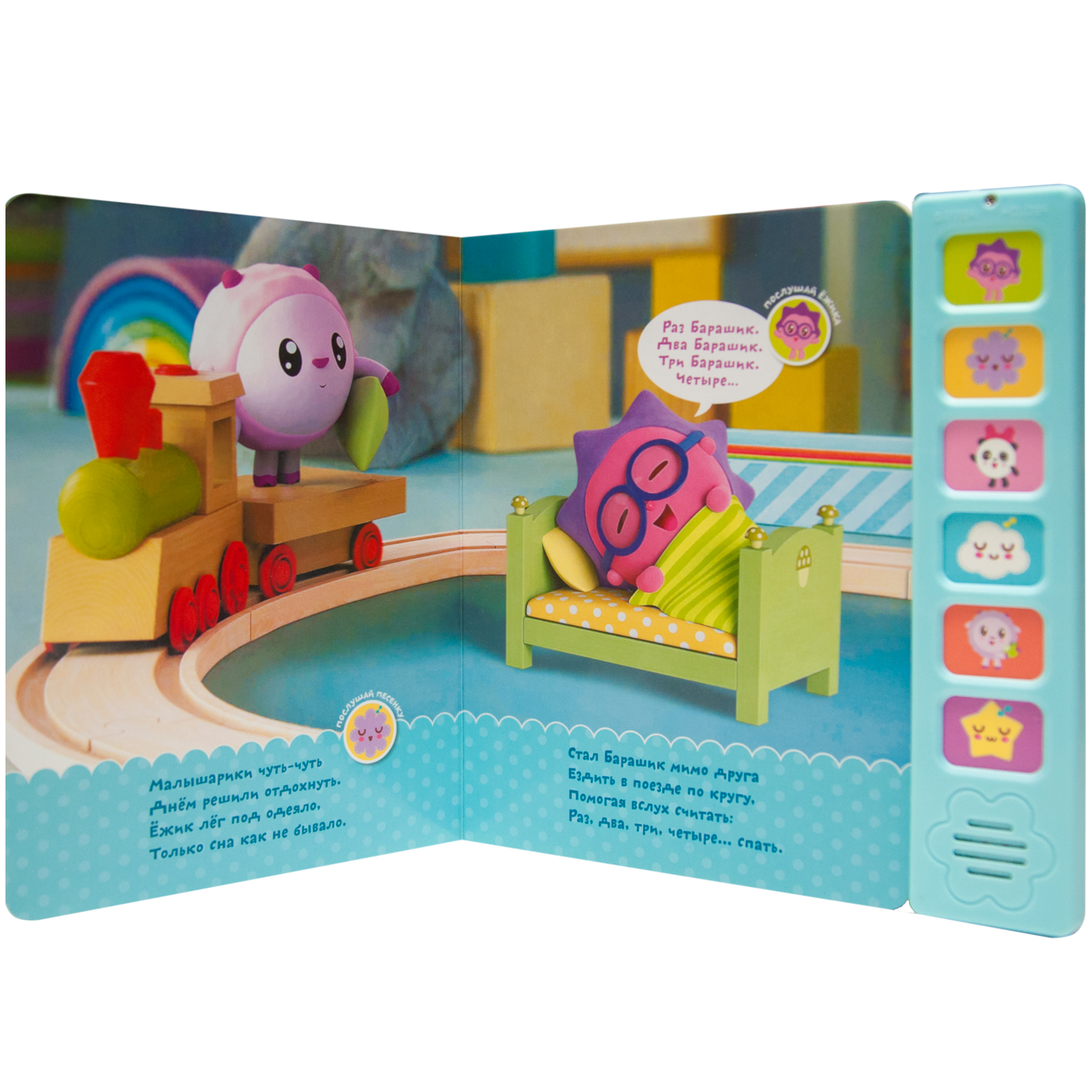 Замечательная звуковая книга «Сладких снов!» серии «Музыкальные Малышарики» станет отличным подарком. Что мы делаем перед сном? Об этом малышу расскажут красочные иллюстрации с героями любимого мультсериала и добрые стихи. Нажимая на кнопки, ребенок услышит 6 разных звуков: голоса Малышариков и их любимые песни.