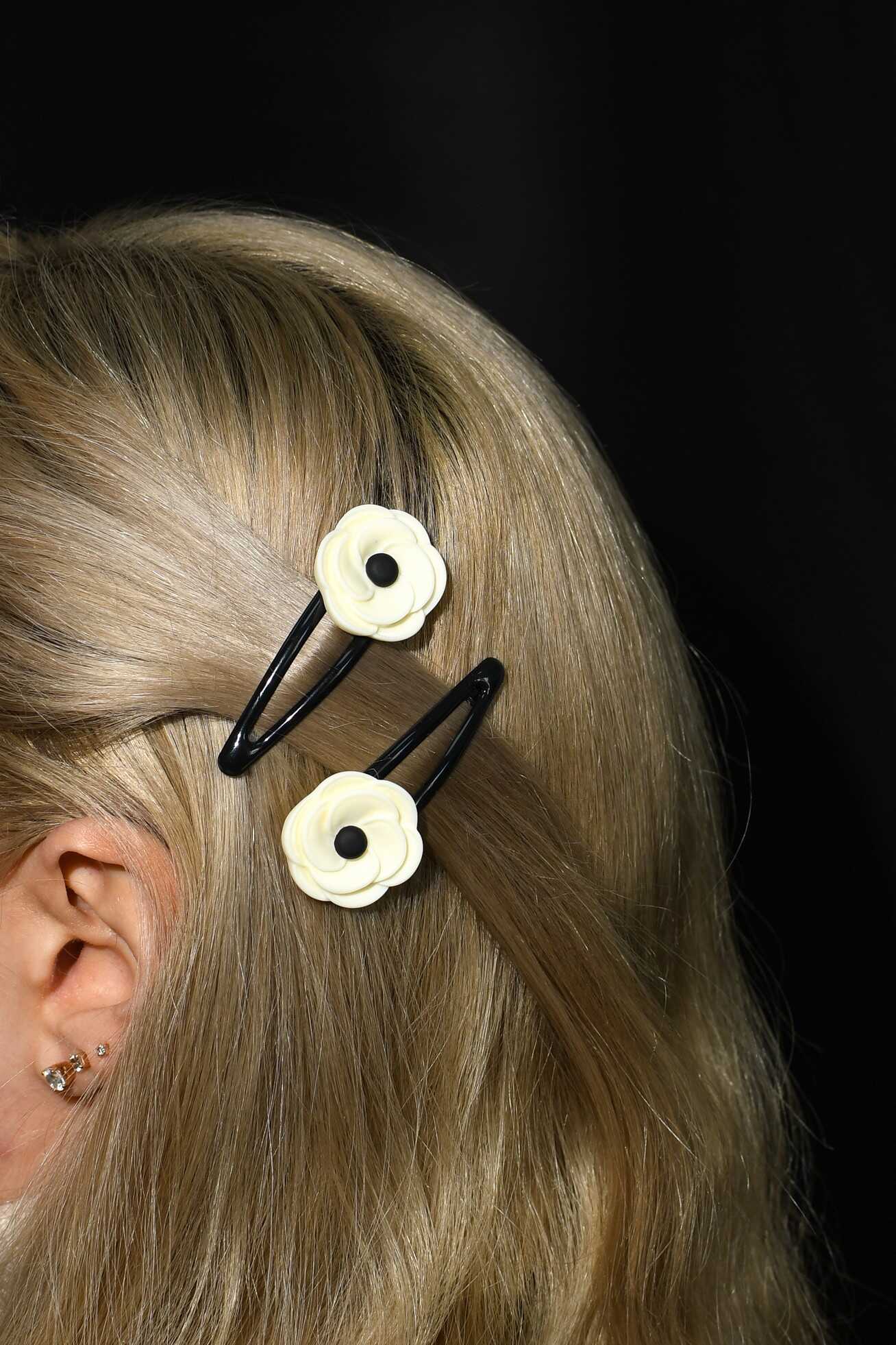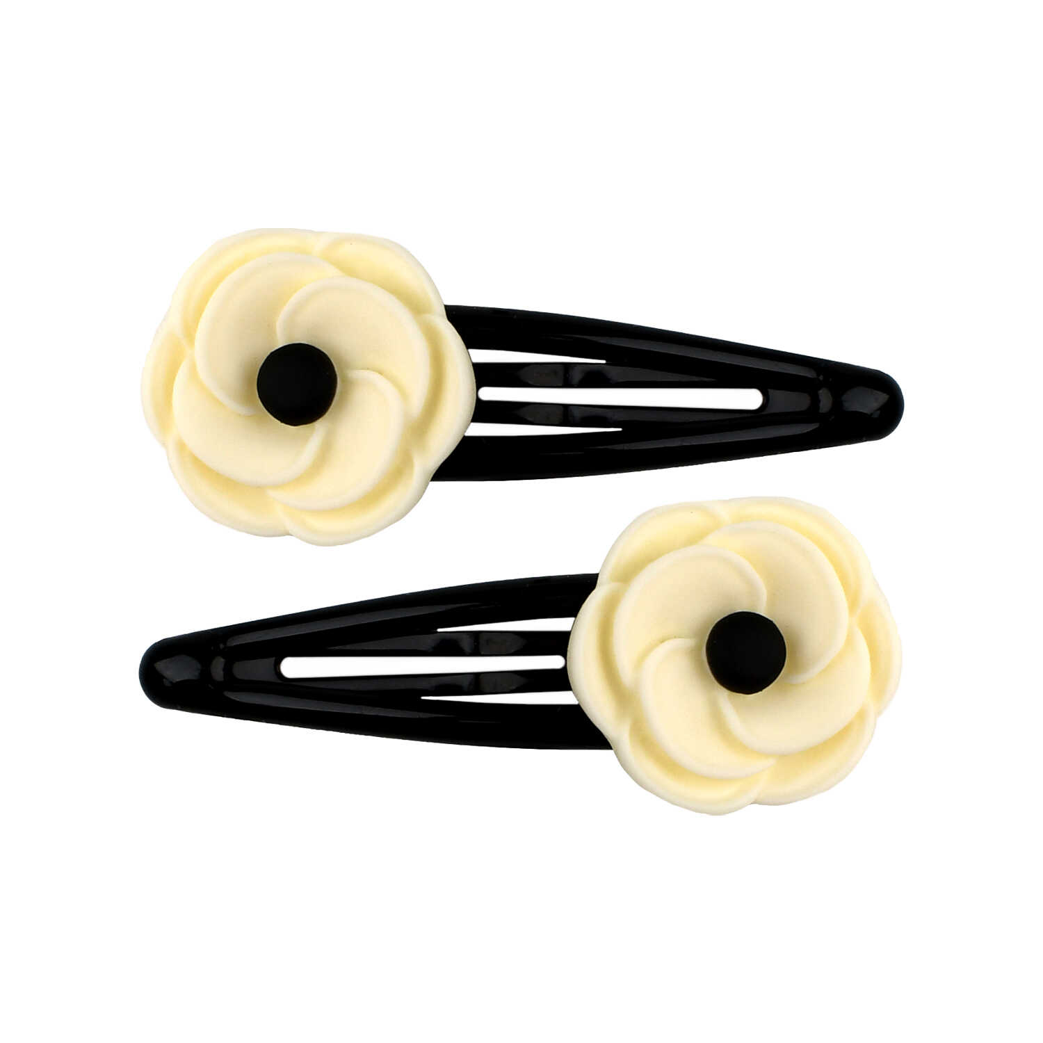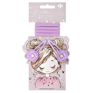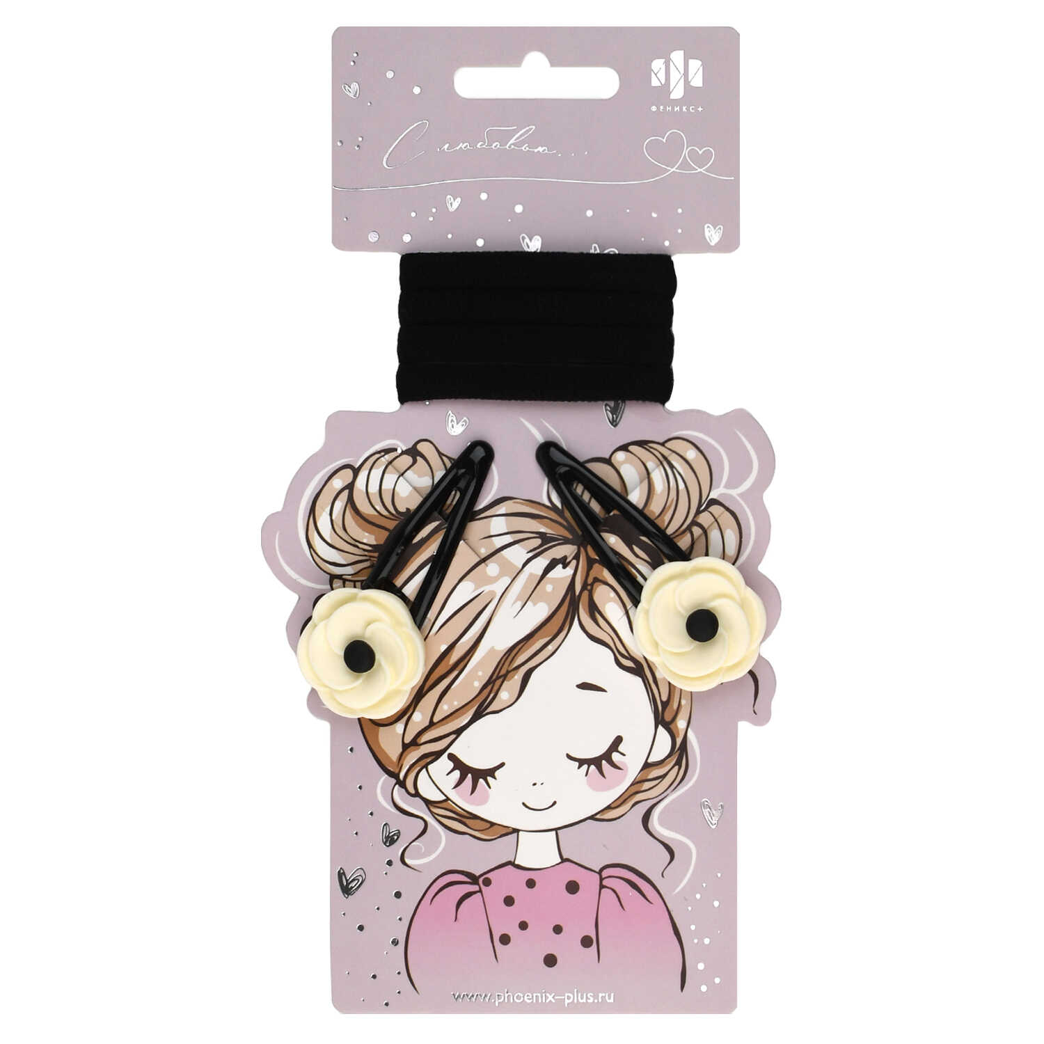 Набор аксессуаров для волос арт. 71760 / 10 ЦВЕТОЧКИ (4 резинки, 2 заколки в наборе, заколки: «клик-клак», глянцевые, ЦВЕТОЧКИ 5,3 см, черный металл, вулканизированная резина, полиэстер, полиэфирная смола, цвет: чёрный, белый, подложка из мелованного картона + ПЭТ-пакет с европодвесом)