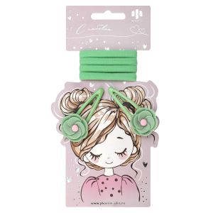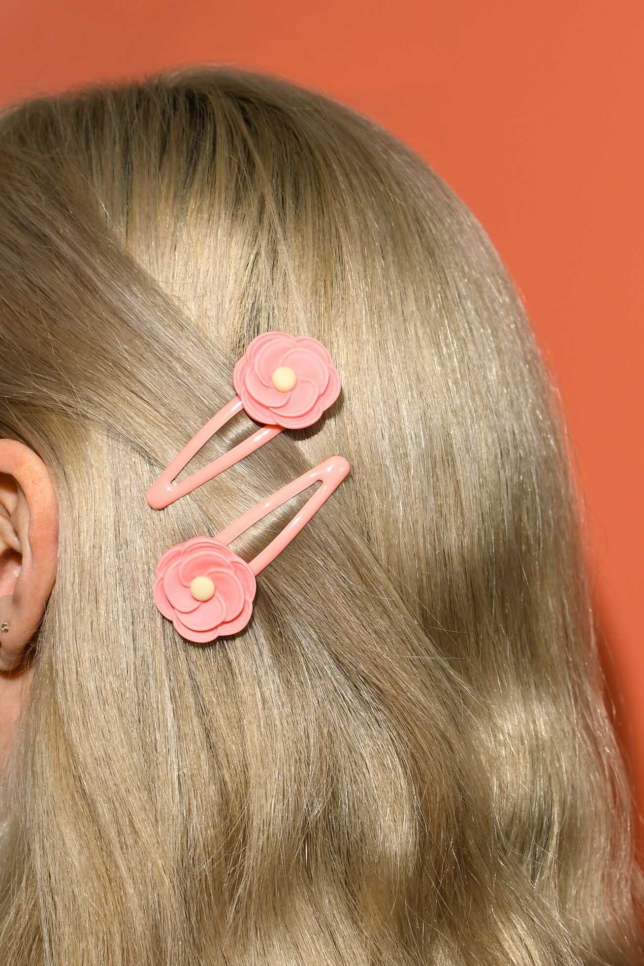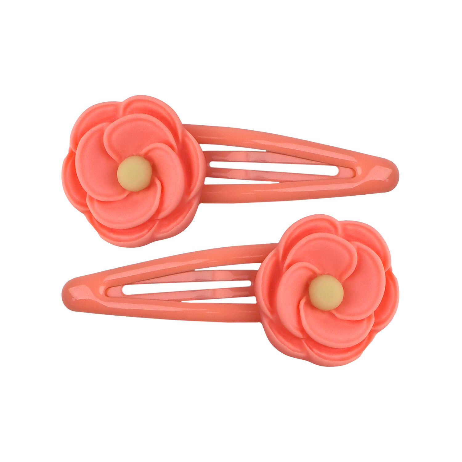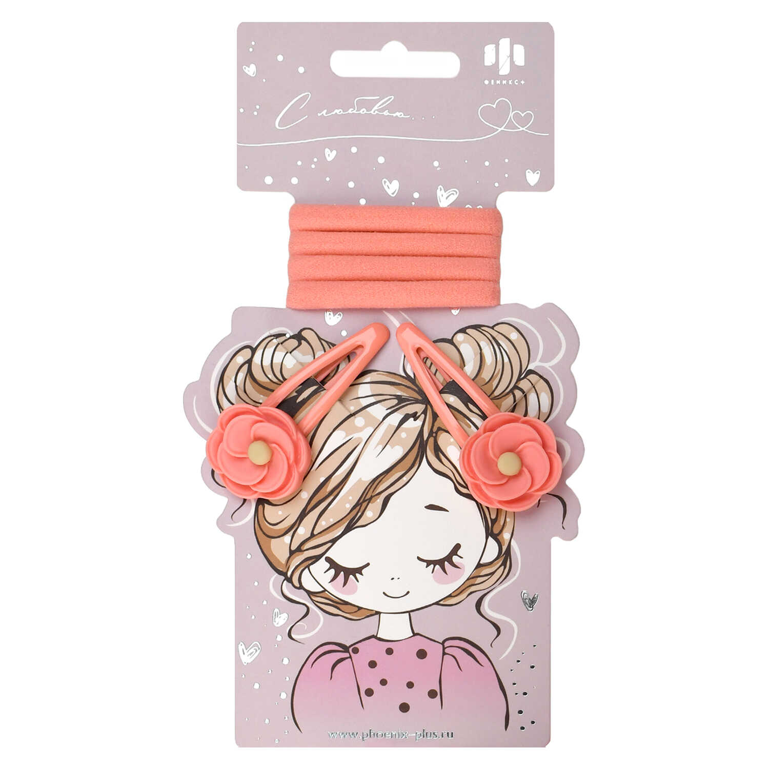 Набор аксессуаров для волос арт. 71763 / 10 ЦВЕТОЧКИ (4 резинки, 2 заколки в наборе, заколки: «клик-клак», глянцевые, ЦВЕТОЧКИ 5,3 см, черный металл, вулканизированная резина, полиэстер, полиэфирная смола, цвет: коралловый, подложка из мелованного картона + ПЭТ-пакет с европодвесом)