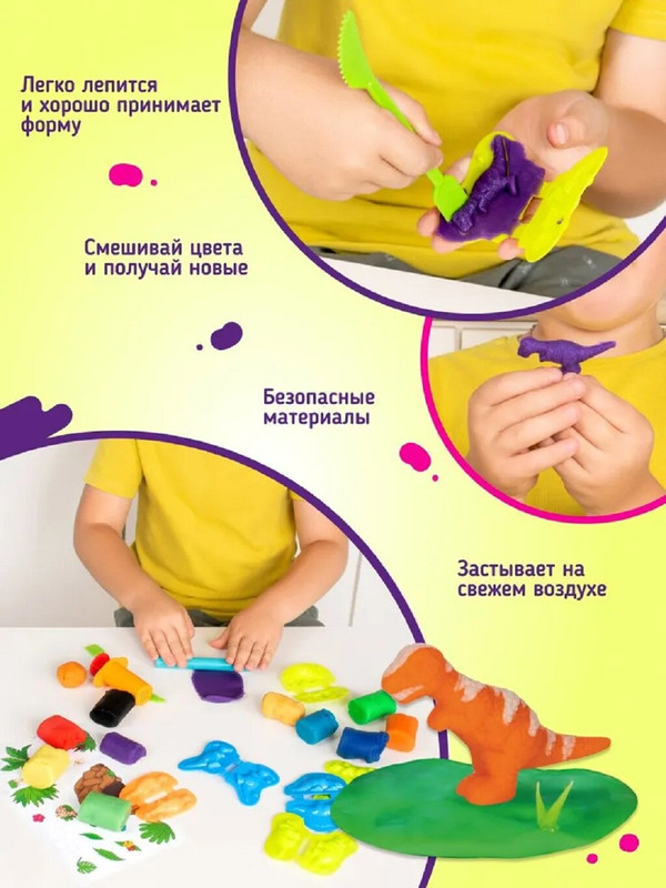 Тесто пластилин воздушный, легкий, приятный на ощупь, хорошо мнется, принимает любую форму легче чем обычный пластилин и обладает приятным ароматом + волшебное тесто можно смешивать и получать в процессе игры много новых необычных цветов. Масса застывает на воздухе, сохраняя получившуюся поделку на долгое время. Чтобы тесто не засыхало, храните его в плотно закрытых пакетиках. Соленое тесто не съедобно, не липнет к рукам и не оставляет следов на мебели, стенах и одежде. Чтобы тесто легче проходило через все давилки, перед игрой рекомендуем его хорошенько размять!