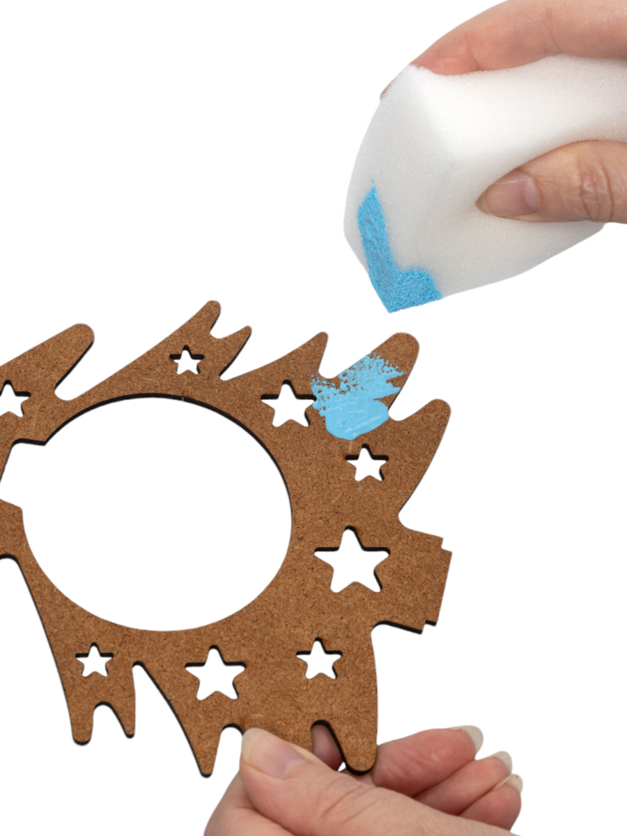 3. Покрасьте ёлочку с помощью губки голубой краской и нанесите глиттер на непросохший слой.